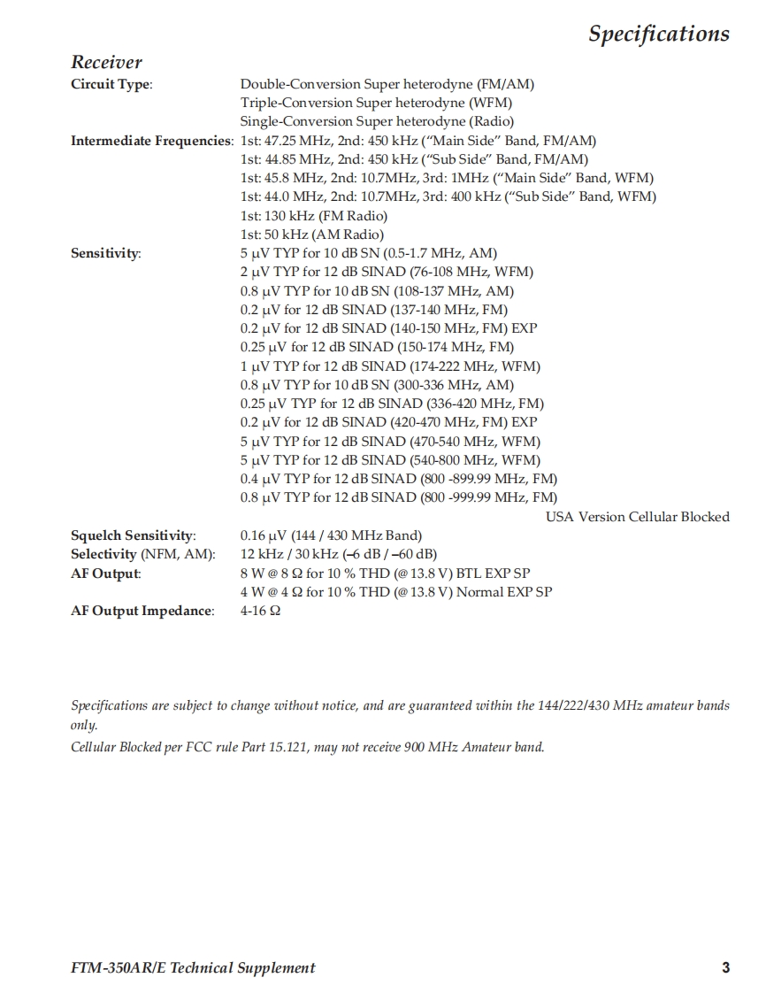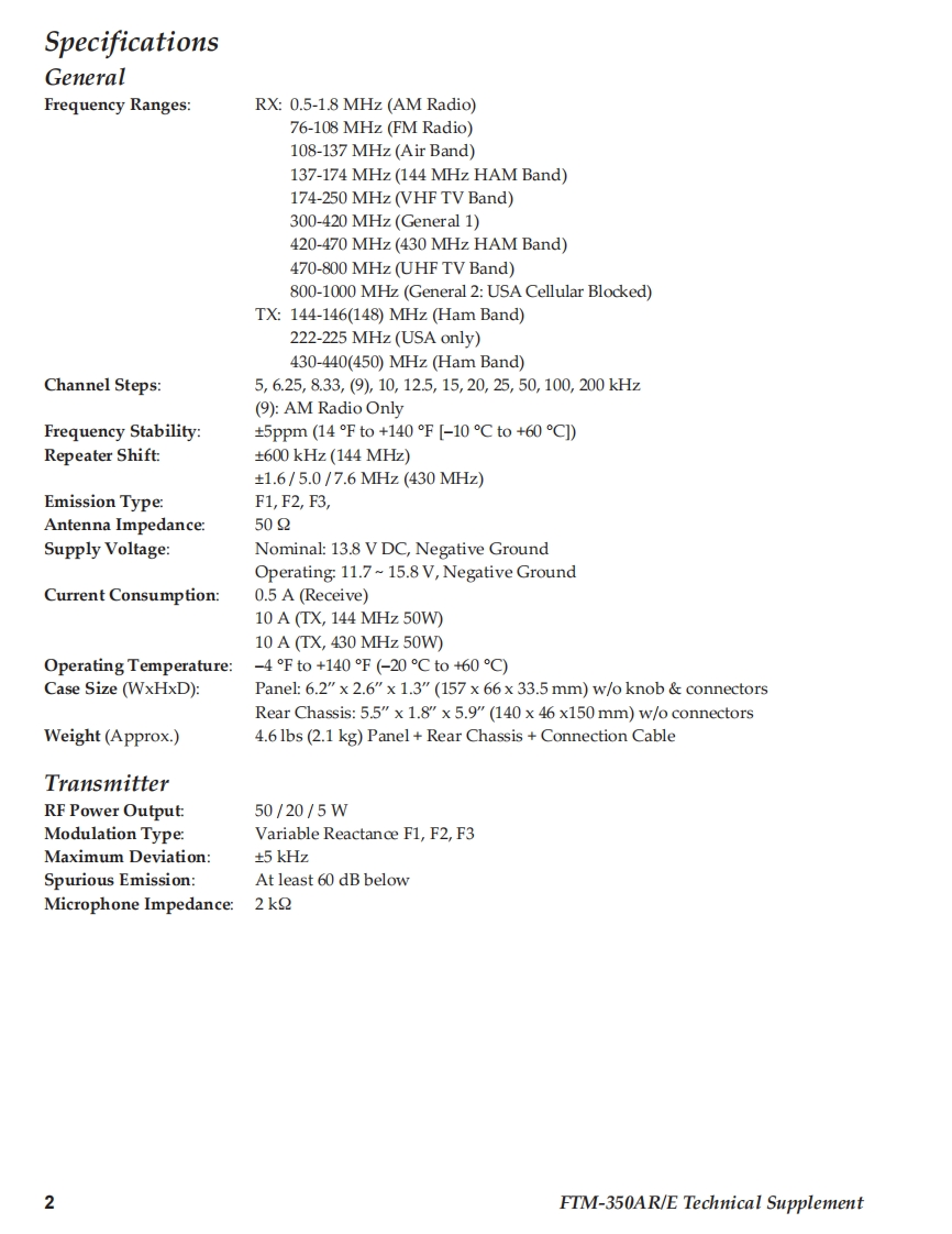 YAESUVERTEX STANDARD CO.,LTD.4-8-8 Nakameguro,Meguro-Ku,Tokyo 153-8644,JapanDUAL BAND FM TRANSCEIVERVERTEX STANDARDFTM-350R/E00Waere CypreCA.U.SAYAESU UK LTD.FTM-350AR/EUnit 12.Sun Valley Business Park,Winnall CloseWinchester,Hampshire,SO23 OLB,U.KVERTEX STANDARD HK LTD.Unit 1306-1308,13F.,Millennium City 2,378 Kwun Tong RoadTechnical SupplementKwun Tong,Kowloon,Hong KongVERTEX STANDARD (AUSTRALIA)PTY.,LTD.Tally Ho Business Park,10 Wesley Court,East Burwood,VIC,315102011 VERTEX STANDARD CO.,LTD.EH033M90DIntroductionThis manual provides technical infommation necessary for ser-vicing the FTM-350AR/E Dual Band FM Transceiver.F吧PTTServicing this equipment requires expertise in handling sur-145.00033000face-mount chip components.Attempts by non-qualified per-sons to service this equipment may result in permanent dam-SET HIV/M SBL LOCK REV POWage not covered by the warranty,and may be illegal in somecountries.Two PCB layout diagrams are provided for each double-sided circuit board in the Transceiver.Each side of isreferred to by the type of the majority of components installed on that side("leaded"or "chip-only").In mostcases one side has only chip components,and the other has either a mixture of both chip and leaded compo-nents(trimmers,coils,electrolytic capacitors,ICs,etc.),or leaded components only.While we believe the technical information in this manual to be correct,VERTEX STANDARD assumes noliability for damage that may occur as a result of typographical or other errors that may be present.Yourcooperation in pointing out any inconsistencies in the technical information would be appreciated.Important NoteThe transceiver was assembled using Pb(lead)free solder,based on the RoHS specification.Only lead-free solder(Alloy Composition:Sn-3.0Ag-0.5Cu)should be used for repairs performed on this appara-tus.The solder stated above utilizes the alloy composition required for compliance with the lead-free specification,and any solder with the above alloy composition may be used.ContentsSpecifications.2PANEL Unit Circuit Diagram (Lot.1~).61Exploded View Miscellaneous Parts............5PANEL Unit Parts Layout (Lot.1).................62PANEL Unit Circuit Diagram (Lot.12~).63Block DiagramPANEL Unit Parts Layout (Lot.12~).......64Alignment…PANEL Unit Parts List...........65PANEL-R Unit Circuit Diagram (Lot.1~).71Board Unit(Schematics,Layouts Parts)PANEL-R Unit Parts Layout (Lot.1~)......72MAIN Unit Circuit Diagram (Lot.1~)17PANEL-R Unit Circuit Diagram (Lot.6~).............73MAIN Unit Parts Layout (Lot.1-)................19PANEL-R Unit Parts Layout (Lot.6~)....74MAIN Unit Circuit Diagram (Lot.5~)21PANEL-R Unit Circuit Diagram (Lot.12~)..........75MAIN Unit Parts Layout (Lot-).23MAIN Unit Parts Layout (Lot.27~)25PANEL-R Unit Parts Layout (Lot.12~).............76PANEL-R Unit Parts List.............77MAIN Unit Parts List29