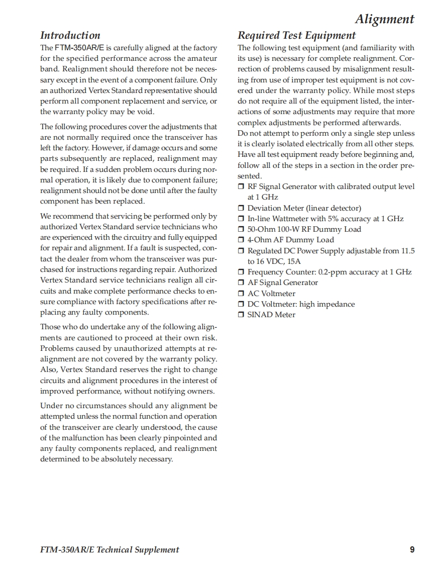 YAESUVERTEX STANDARD CO.,LTD.4-8-8 Nakameguro,Meguro-Ku,Tokyo 153-8644,JapanDUAL BAND FM TRANSCEIVERVERTEX STANDARDFTM-350R/E00Waere CypreCA.U.SAYAESU UK LTD.FTM-350AR/EUnit 12.Sun Valley Business Park,Winnall CloseWinchester,Hampshire,SO23 OLB,U.KVERTEX STANDARD HK LTD.Unit 1306-1308,13F.,Millennium City 2,378 Kwun Tong RoadTechnical SupplementKwun Tong,Kowloon,Hong KongVERTEX STANDARD (AUSTRALIA)PTY.,LTD.Tally Ho Business Park,10 Wesley Court,East Burwood,VIC,315102011 VERTEX STANDARD CO.,LTD.EH033M90DIntroductionThis manual provides technical infommation necessary for ser-vicing the FTM-350AR/E Dual Band FM Transceiver.F吧PTTServicing this equipment requires expertise in handling sur-145.00033000face-mount chip components.Attempts by non-qualified per-sons to service this equipment may result in permanent dam-SET HIV/M SBL LOCK REV POWage not covered by the warranty,and may be illegal in somecountries.Two PCB layout diagrams are provided for each double-sided circuit board in the Transceiver.Each side of isreferred to by the type of the majority of components installed on that side("leaded"or "chip-only").In mostcases one side has only chip components,and the other has either a mixture of both chip and leaded compo-nents(trimmers,coils,electrolytic capacitors,ICs,etc.),or leaded components only.While we believe the technical information in this manual to be correct,VERTEX STANDARD assumes noliability for damage that may occur as a result of typographical or other errors that may be present.Yourcooperation in pointing out any inconsistencies in the technical information would be appreciated.Important NoteThe transceiver was assembled using Pb(lead)free solder,based on the RoHS specification.Only lead-free solder(Alloy Composition:Sn-3.0Ag-0.5Cu)should be used for repairs performed on this appara-tus.The solder stated above utilizes the alloy composition required for compliance with the lead-free specification,and any solder with the above alloy composition may be used.ContentsSpecifications.2PANEL Unit Circuit Diagram (Lot.1~).61Exploded View Miscellaneous Parts............5PANEL Unit Parts Layout (Lot.1).................62PANEL Unit Circuit Diagram (Lot.12~).63Block DiagramPANEL Unit Parts Layout (Lot.12~).......64Alignment…PANEL Unit Parts List...........65PANEL-R Unit Circuit Diagram (Lot.1~).71Board Unit(Schematics,Layouts Parts)PANEL-R Unit Parts Layout (Lot.1~)......72MAIN Unit Circuit Diagram (Lot.1~)17PANEL-R Unit Circuit Diagram (Lot.6~).............73MAIN Unit Parts Layout (Lot.1-)................19PANEL-R Unit Parts Layout (Lot.6~)....74MAIN Unit Circuit Diagram (Lot.5~)21PANEL-R Unit Circuit Diagram (Lot.12~)..........75MAIN Unit Parts Layout (Lot-).23MAIN Unit Parts Layout (Lot.27~)25PANEL-R Unit Parts Layout (Lot.12~).............76PANEL-R Unit Parts List.............77MAIN Unit Parts List29