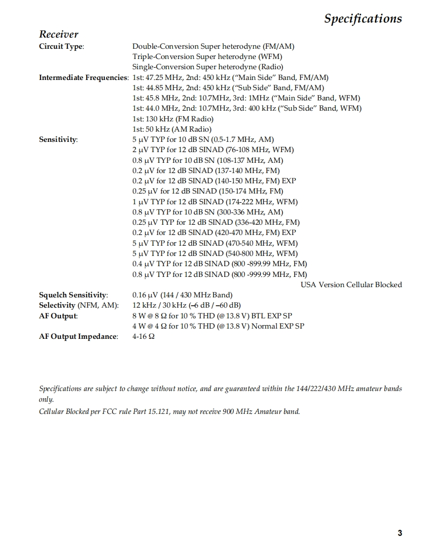 NSYAESUVERTEX STANDARD CO.,LTD.4-8-8 Nakameguro,Meguro-Ku,Tokyo 153-8644,JapanVERTEX STANDARDDUAL BAND FM TRANSCEIVERUS Headquarters10900 Walker Street,Cypress,CA 90630.U.S.A.YAESU UK LTD.FTM-350R/EWier NampnteCeVERTEX STANDARD HK LTD.Unit 5,20/F.,Seaview Centre,139-141 Hoi Bun RoadTechnical SupplementKwun Tong,Kowloon,Hong KongVERTEX STANDARD(AUSTRALIA)PTY.,LTD.Nomanby Business Park,Unit 14/45 Normanby Road2010 VERTEX STANDARD CO.,LTD.Notting Hill 3168,Victoria,AustraliaEH033M90BIntroductionThis manual provides technical information necessary for ser-vicing the FTM-350R/E Dual Band FM Transceiver.如PTTServicing this equipment requires expertise in handling sur-14500033000face-mount chip components.Attempts by non-qualified per-Dsons to service thisequipment may result in permanent dam-V/M SBL LDCK REV POWage not covered by the warranty,and may be illegal in somecountries.Two PCB layout diagrams are provided for each double-sided circuit board in the Transceiver.Each side of isreferred to by the type of the majority of components installed on that side("leaded"or"chip-only").In mostcases one side has only chip components,and the other has either a mixture of both chip and leaded compo-nents(trimmers,coils,electrolytic capacitors,ICs,etc.),or leaded components only.While we believe the technical information in this manual to be correct,VERTEX STANDARD assumes noliability for damage that may occur as a result of typographical or other errors that may be present.Yourcooperation in pointing out any inconsistencies in the technical information would be appreciated.Important NoteThe transceiver was assembled using Pb(lead)free solder,based on the RoHS specification.Only lead-free solder (Alloy Composition:Sn-3.0Ag-0.5Cu)should be used for repairs performed on this appara-tus.The solder stated above utilizes the alloy composition required for compliance with the lead-free specification,and any solder with the above alloy composition may be used.ContentsSpecifications2PANEL Unit Circuit Diagram (Lot.1)57Exploded View Miscellaneous Parts............5PANEL Unit Parts Layout (Lot1)58PANEL Unit Circuit Diagram (Lot.12~).............59Block Diagram.9PANEL Unit Parts Layout (Lot.12~)....................60Alignment……9PANEL Unit Parts List61PANEL-R Unit Circuit Diagram (Lot.1~).............67Board Unit (Schematics,Layouts Parts)PANEL-R Unit Parts Layout (Lot.1~)............68MAIN Unit Circuit Diagram (Lot.1~).................17PANEL-R Unit Circuit Diagram (Lot.6~)............69MAIN Unit Parts Layout (Lot1).19PANEL-R Unit Parts Layout (Lot.6~).............0MAIN Unit Circuit Diagram (Lot.5~)................21PANEL-R Unit Circuit Diagram (Lot.12~)...........71MAIN Unit Parts Layout (Lot.5~)................23PANEL-R Unit Parts Layout (Lot.12~).............72MAIN Unit Parts List.…25PANEL-R Unit Parts List.3