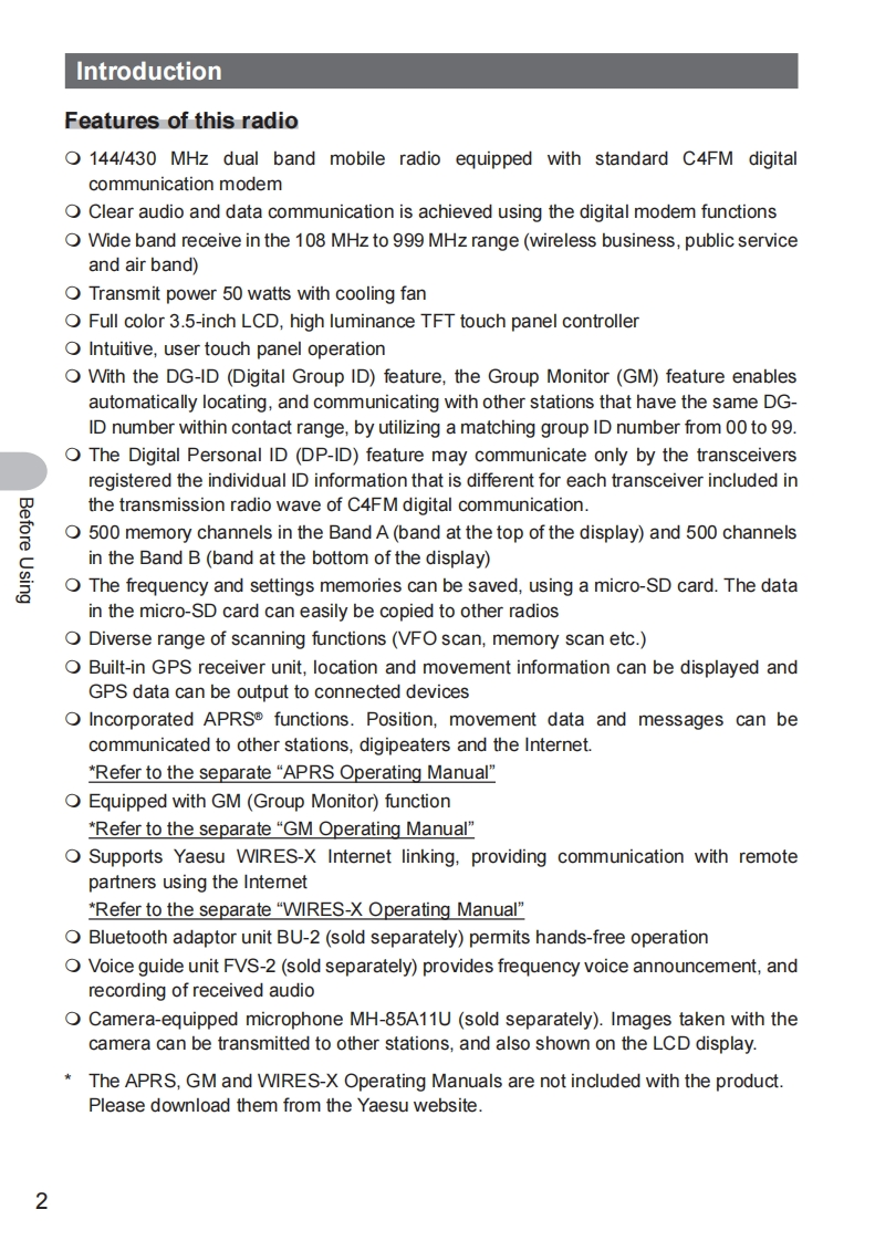 YAESUThe radioFTM-400XDR/DEOperating Manual144/430MHz50WDUAL BAND TRANSCEIVERC4FM/FMBefore UsingInstallation and ConnectionBasic OperationsDG-ID DP-ID FunctionUsing the MemoryScanningUsing the GPS FunctionVF4"146.520OLmUsing the APRS FunctionVF446.500Using the GM FunctionOLUsing the WIRES-X FunctionV/M SQL MUTE SCOPEConvenient FunctionsFunctions to be usedwhen NecessaryCustomize Menu Settingsand User PreferencesAppendix