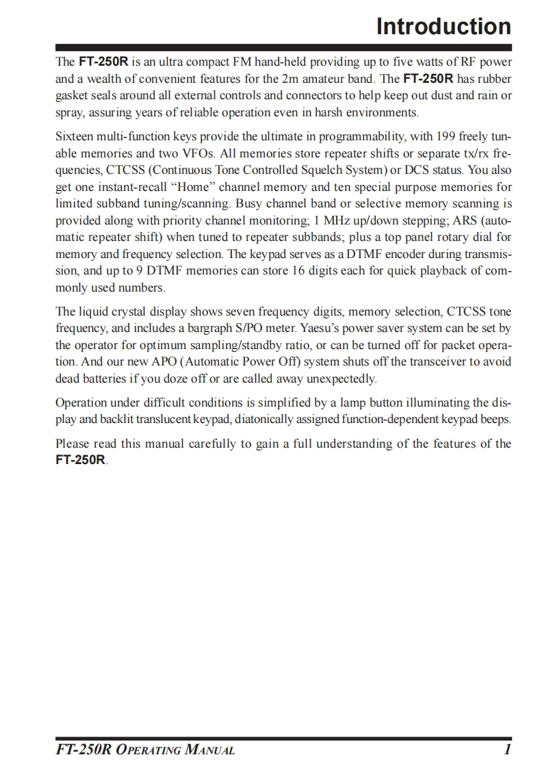 YAESUVHF FM TRANSCEIVERFT-250ROPERATING MANUAL910000YAESUVERTEX STANDARD CO.,LTD.4-8-8 Nakameguro,Meguro-Ku,Tokyo 153-8644,JapanVERTEX STANDARDUS Headquarters10900 Walker Street,Cypress,CA 90630,U.S.A.YAESU UK LTD.FT-250Unit 12.Sun Valley Business Park,Winnall CloseWinchester,Hampshire,SO23 0LB,U.K.VERTEX STANDARD HK LTD.P1Unit 1306-1308,13F.,Millennium City 2,378 Kwun Tong Road,8品Kwun Tong,Kowloon,Hong KongVERTEX STANDARD(AUSTRALIA)PTY.,LTD.Tally Ho Business Park,10 Wesley Court,East Burwood,VIC,3151