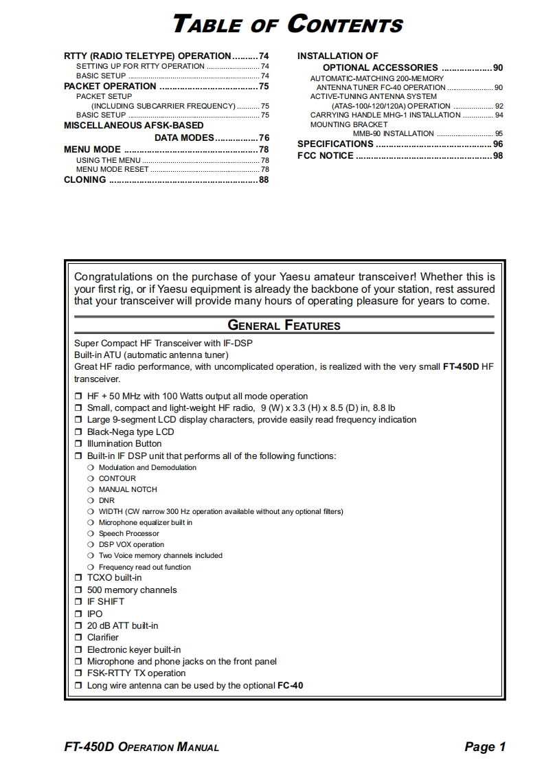 YAESUHF/50 MHz TRANSCEIVERFT-450DOPERATION MANUAL■叉罗觉巴21295.00F0-VERTEX STANDARD CO.,LTD.4-8-8 Nakameguro,Meguro-Ku,Tokyo 153-8644,JapanVERTEX STANDARDUS Headquarters10900 Walker Street,Cypress,CA90630,U.S.A.YAESU UK LTD.Unit 12,Sun Valley Business Park,Winnall CloseWinchester.Hampshire.SO23 OLB.U.K.VERTEX STANDARD HK LTD.Unit 5,20/F.,Seaview Centre,139-141 Hoi Bun Road,Kwun Tong,Kowloon,Hong KongVERTEX STANDARD(AUSTRALIA)PTY.,LTD.Normanby Business Park,Unit 14/45 Normanby RoadNotting Hill 3168,Victoria,Australia