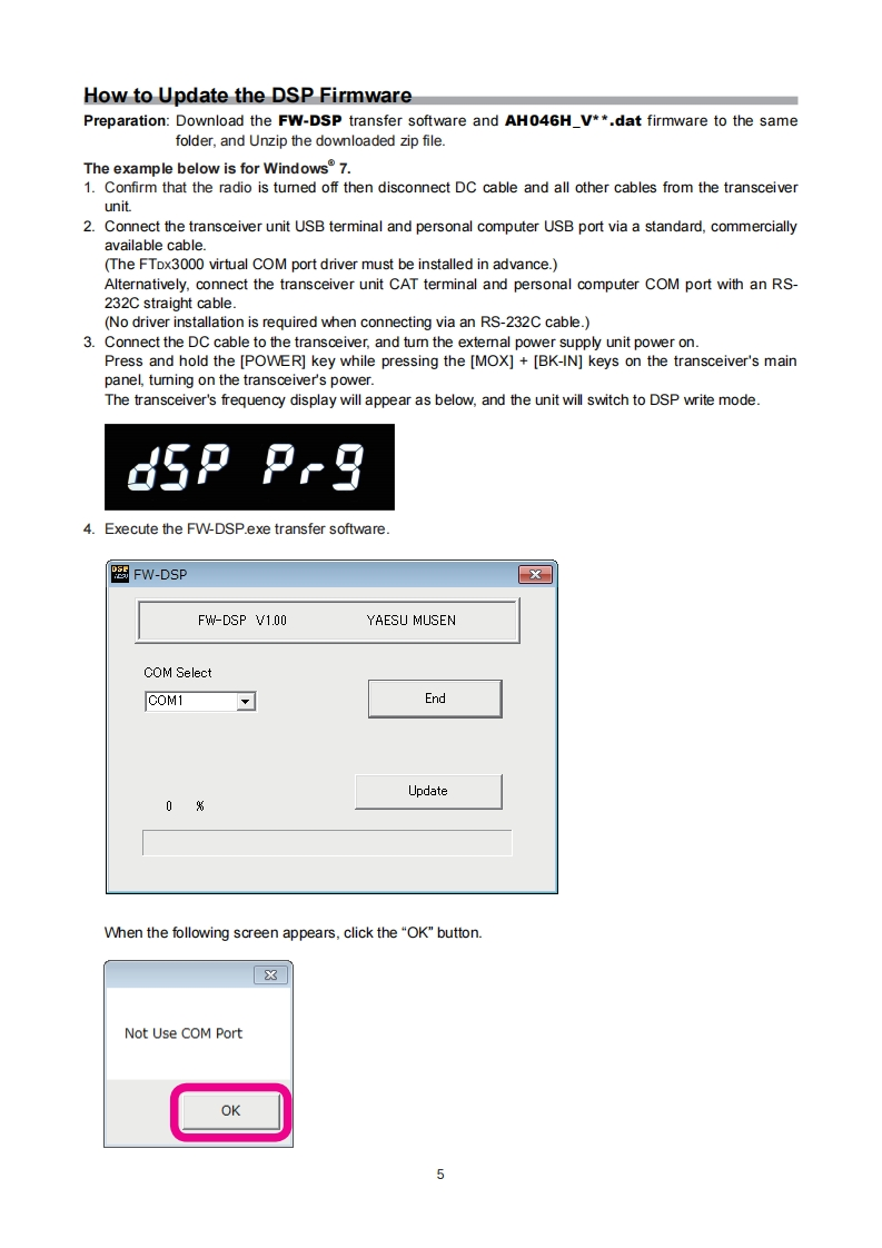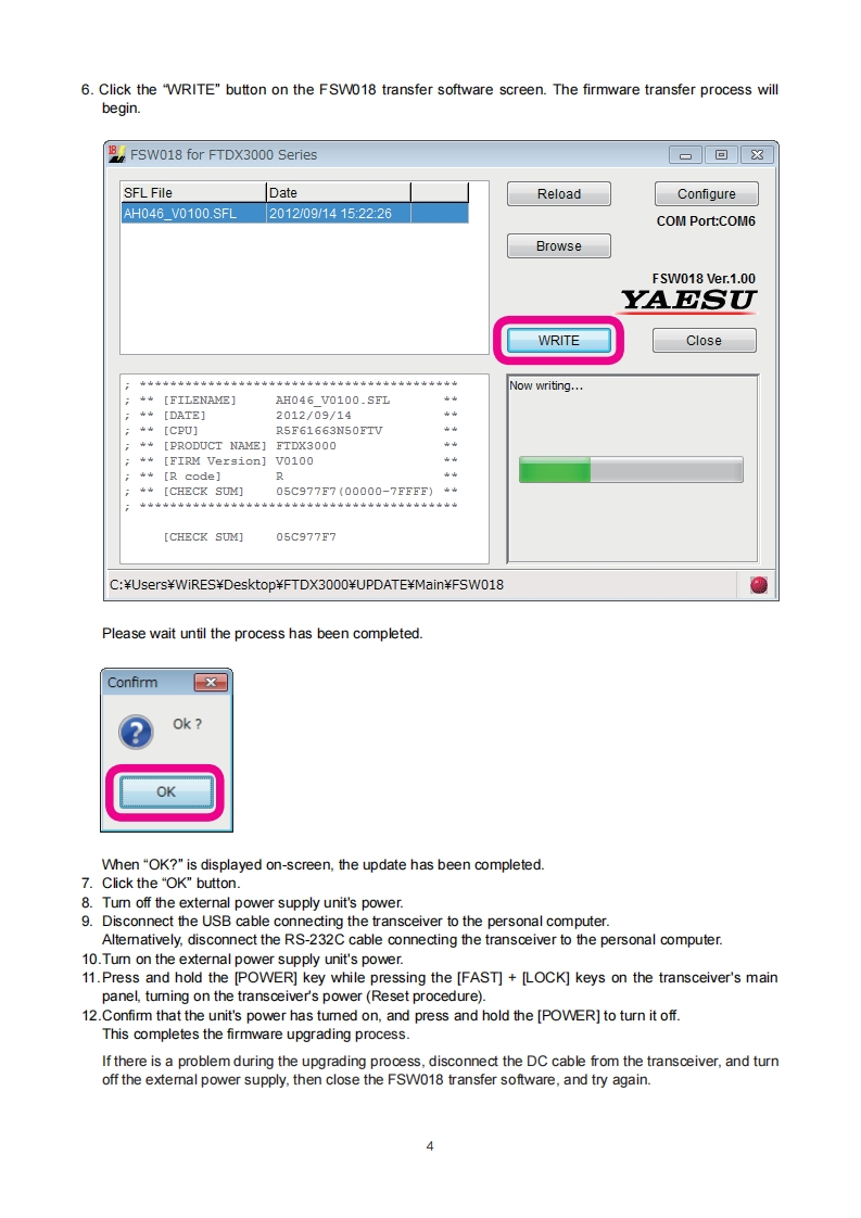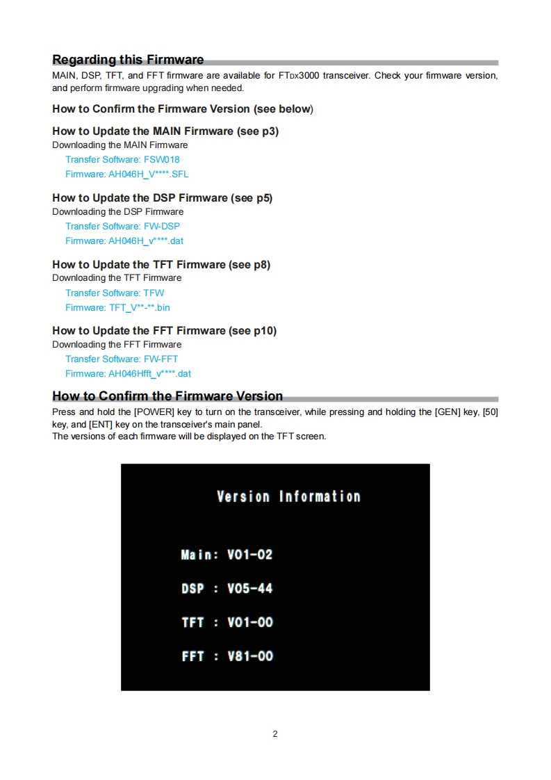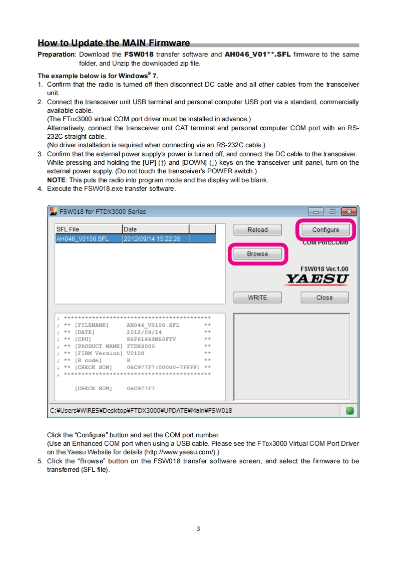 YAESUFTDX3000The radioFirmware Upgrade ManualThis software is personal computer software,used to update the firmware of a FTDx3000 transceiver afterconnecting it to a personal computer.ImportantBefore downloading this software,please read the "Important Notes"carefully.Downloading or installing this software will be taken as indicating your agreement with the contents of the"Important Notes"'Transceiver"is used hereafter to refer to FTox3000 transceiver.Important NotesAll responsibility for the usage of this software lies with the customer.We cannot be held responsiblein any way for any damages or losses which may be incurred by the customer as a result of using thissoftware.Copyrights and all other intellectual property rights for the software,as well as the software manual,arethe property of YAESU MUSEN CO.,LTD.The revision,modification,reverse engineering,and decompiling of this software is prohibited.Redistribution,transfer,and resale of downloaded files are also prohibited.Downloaded files may only be used for personal use.If you cannot perform firmware upgrading yourself,please consult with one of our sales sites or service centers.System Requirements (Operating Environment)Supported Operating Systems·Microsoft Windows7Microsoft Windows VistaTM(Service Pack 1 or later)Microsoft Windows XP(Service Pack 3 or later)x To upgrade the TFT Firmware on your FTDx3000,you must first install "Microsoft.NET Framework 3.5"onto the personal computer before beginning the firmware upgrade process.CPUCPU which satisfies OS(operating system)requirementsRAM(System Memory)Amount of RAM(system memory)meeting or exceeding OS(operating system)requirementsHDD(Hard Disk)HDD (hard disk)with capacity meeting or exceeding OS(operating system)requirementsIn addition to having sufficient free space for the OS to operate,the program requires 20 Mbyte or more offree space.PortsUSB port (USB1.1/USB2.0)or RS-232C interface(COM port)Do not connect the USB cable to your personal computer and FTDx3000 until after the "virtual COM portdriver"installation is completed,because the wrong driver may be installed.USB Driver(for Performing Version Upgrade via the USB Port)Install the FTDx3000 virtual COM port driver in the personal computer before beginning the firmware upgradeprocess.Please see the FTDx3000 USB Driver (Virtual COM Port Driver)on the Yaesu Website for details(http://www.yaesu.com/).CablesUSB cable (AB type)or RS-232C straight cablePlease have a commercially available cable ready.