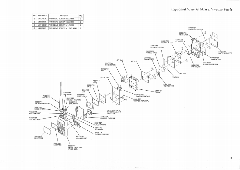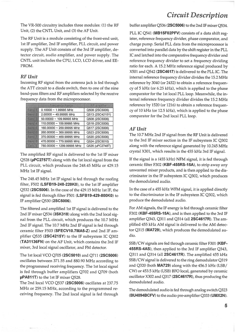 VERTEX STANDARD CO.,LTD.4-8-8 Nakameguro.Meguro-Ku.Tokyo 153-8644.JapanCOMMUNICATIONS RECEIVERVERTEX STANDARDUS Headquarters17210 Edwards Rd,Cerritos,CA 90703,U.S A.w5nc Sute 21,MamVR-500YAESU EUROPE BV.P.O.Box Schphol,The NetherlandsYAESU UK LTD.Unit 12.Sun Valley Businass Park,Winnall CloseTechnical Supplementwinchester.Hampshire,$023 CLB.U.KYAESU GERMANY GmbHAm Kronberger Hang 2.D-65824 Schwalbach.Germany@2001 VERTEX STANDARD CO.,LTD.Printed in Japan.VERTEX STANDARD HK LTD.Unit 5,20/F,Seaview Centre,139-141 Hoi Bun Road,Kwun Tong.Kowloon,Hong KongIntroductionThis manual provides technical information necessaryfor servicing the Yaesu VR-500 Communications Receiv-er.Information on its installation and operation can befound in the VR-500 Operating Manual,which is provid-ed with the receiver,and Accessory information may befound in the documents accompanying the optional equip-ment.The VR-500 is a high-performance miniature commu-nications receiver providing general coverage receptionfrom 100 kHz to 1300 MHz on the CW,SSB (LSB and USB),AM,and FM(Wide and Narrow bandwidths)modes(this高高高coverage includes the AM and FM broadcast bands,HFShort-wave Bands up to 16 MHz,VHF and UHF TV bands,nents (trimmers,coils,electrolytic capacitors,packagedthe VHF AM aircraft band,and a wide range of commer-ICs,etc.),or lead components only.cial and public safety frequencies!).While we believe the technical information in this man-Servicing this equipment requires expertise in handlingual is correct,VERTEX STANDARD assumes no liabilitysurface mount chip components.Attempts by unqualifiedfor damage that may occur as a result of typographical orpersons to service this equipment may result in perma-other errors that may be present.Your cooperation innent damage not covered by warranty.For the major cir-pointing out any inconsistencies in the technical informa-cuit boards,each side of the board is identified by the typetion would be appreciated.VERTEX STANDARD reservesof the majority of components installed on that side.Inthe right to make changes in this receiver and the align-most cases one side has only chip components,and thement procedures,in the interest of technological improve-other has either a mixture of both chip and lead compo-ment,without notification of owners.ContentsSpecifications.........2Exploded View Miscellaneous Parts...3Circuit Description .............66046444644444044444*5Alignment..7Bl0 ck Diagram….14Board Unit (Schematics,Layouts Parts)μCOM Unit15AF Unit…27RFUnit…37VCO Unit.53SW Unit…4.57