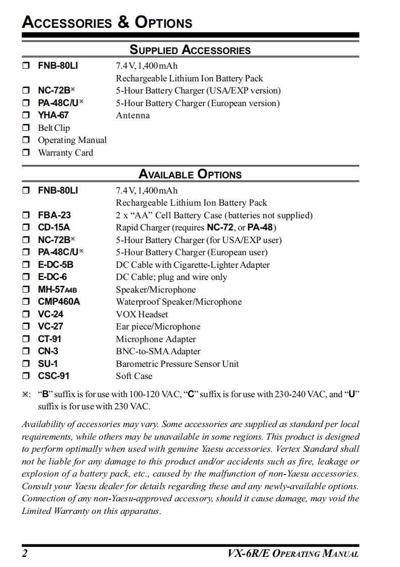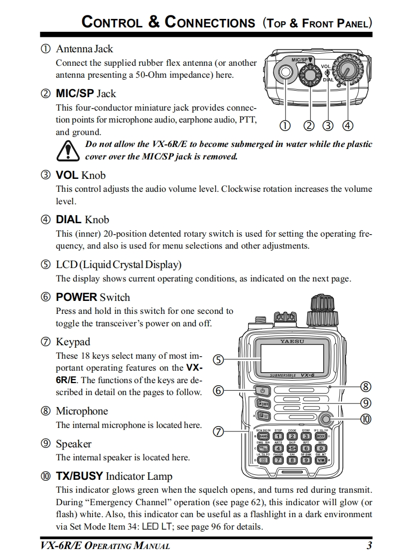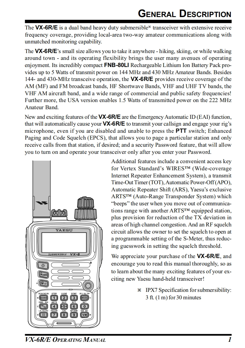 YAESUDUAL BANDHEAVY DUTY SUBMERSIBLE TRANSCEIVERVX-6RIEOPERATING MANUALYAESU'008FN SIEEROINID■SU市MERSISLE VX-6VERTEX STANDARD CO.,LTD.4-8-8 Nakameguro,Meguro-Ku,Tokyo 153-8644,JapanVERTEX STANDARD U.S.A.Inc.6125 Phyllis Drive,Cypress,Califomia 90630,U.S.AYAESU UK LTD.Unit 12,Sun Valley Business Park,Winnall CloseWinchester,Hampshire,SO23 0LB.U.K.TVERTEX STANDARD HK LTD5Unit 1306-1308,13F.,Millennium City 2,378 Kwun Tong Road,789Kwun Tong,Kowloon,Hong KongVERTEX STANDARD(AUSTRALIA)PTY.,LTD.Tally Ho Business Park,10 Wesley Court,East Burwood,VIC,3151
