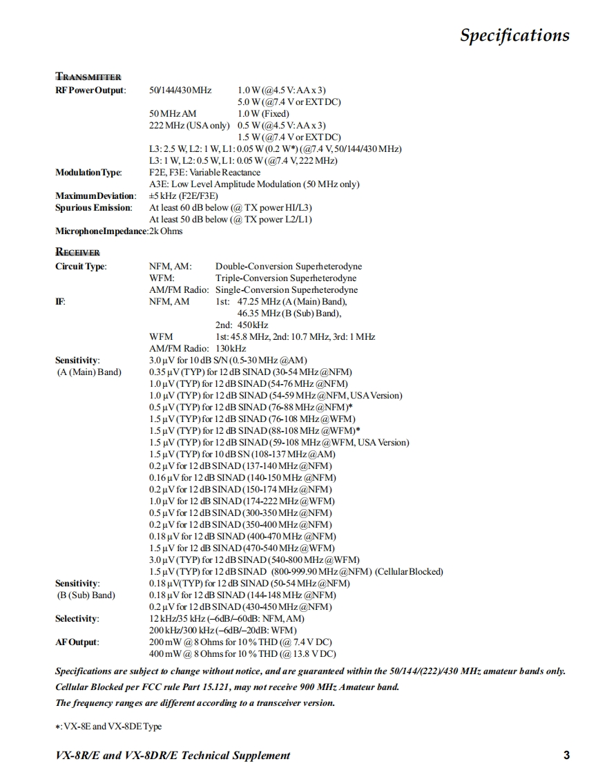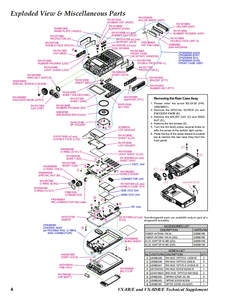 50/144/430 MHz Triple-BandVERTEX STANDARD CO.,LTD.4-8-8 Nakameguro,Meguro-Ku,Tokyo 153-8644,JapanHeavy Duty Submersible TransceiverVERTEX STANDARDVX-8R/EUS Headquarters10900 Walker Street,Cypress,CA 90630,U.S.A.YAESU UK LTD.VX-8DR/EUnit 12,Sun Valley Business Park,Winnall CloseWinchester,Hampshire,SO23 0LB,U.K.Technical SupplementVERTEX STANDARD HK LTD.Unit 5.20/F..Seaview Centre.139-141 Hoi Bun Road.Kwun Tong,Kowloon,Hong Kong2010 VERTEX STANDARD CO.,LTD.Printed in Japan.VERTEX STANDARD(AUSTRALIA)PTY.,LTD.Normanby Business Park,Unit 14/45 Nomanby RoadEH029M90FNotting Hill 3168,Victoria,AustraliaIntroductionThis manual provides the technical information necessary for servicing the VX-8R/Eand VX-8DR/E 50/144/430 MHzTriple-Band Heavy Duty Submersible Transceiver.Servicing this equipment requires expertise in handing surface-mount chip components.Attempts by non-qualified persons to service this equipment may result in permanentdamage not covered by the warranty,and may be illegal in some countries.Two PCB layout diagrams provided for each double-sided board in this transceiver.Each side of the board is referred to by the type of the majority of components installed onthat side("Side A"or"Side B").In most cases one side has only chip components,and theother has either a mixture of both chip and leaded components(trimmers,coils,electrolyticcapacitors,ICs,etc.),or leaded components only.While we believe the information in this manual to be correct,VERTEX STANDARDassumes no liability for damage that may occur as a result of typographical or other errorsthat may be present.Your cooperation in pointing out any inconsistencies in the technicalinformation would be appreciated.Important Note1)This transceiver was assembled using Pb(lead)free solder,based on the RoHS specification.Only lead-free solder(Alloy Composition:Sn-3.0Ag-0.5Cu)should be used for repairs performed on this apparatus.The solder statedabove utilizes the alloy composition required for compliance with the lead-free specification,and any solder with the above alloycomposition may be used.2)Risk of explosion if battery is replaced by an incorrect type.Dispose of used batteries according to the instructions.ContentsSpecification....,2Exploded View Miscellaneous Parts4Block Diagram…6Alignment>Board Unit(Schematics,Layouts Parts)RF Unit (Lot.1-4)VX-8R Type Onhy ...............444444444444444444444444444444444444425RF Unit (Lot.5-7)VX-8R Type Only27RF Unit Parts List (Lot.1-7)VX-8R Type Only29RF-2 Unit (Lot.8-15)VX-8R Type Only .........47RF-2 Unit (Lot..l6-)VX-8R/E Type.…49RF-2 Unit (Lot.24-)VX-8DR/E Type .....51RF-2 Unit Parts List (Lot.8-)VX-8R and VX-8DR/E Type.444444444444444444444444444444444444453CNTL Unit (Lot.1-4)VX-8R Type Only73CNTL Unit (Lot.5-7)VX-8R Type Only ...........4444444444444444444444444444444444444444444444444444444475CNTL Unit Parts List (Lot.1-7)VX-8R Type Only ...77CNTL-2 Unit (Lot.8-15)VX-8R Type Only.............................87CNTL-2Unit(L0t16-)VX-8R/E Type…89CNTL-