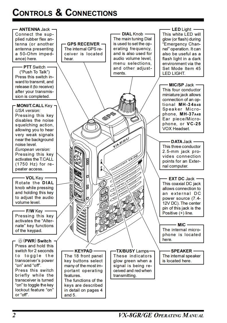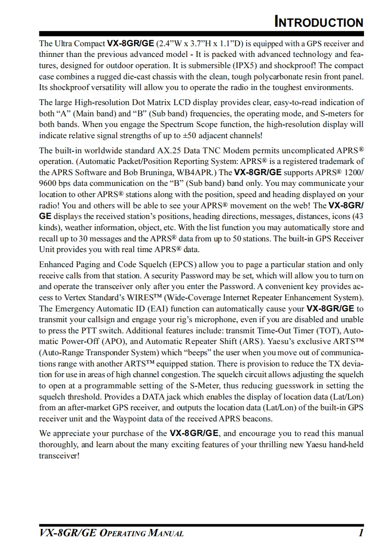 YAESU144/430MHzDUAL BAND FM TRANSCEIVERWITH GPSVX-8GRIGEOPERATING MANUALYAESU6肥Bkn/h12GPS TRANSCEIVER VX-8GVERTEX STANDARD CO.,LTD4-8-8 Nakameguro,Meguro-Ku,Tokyo 153-8644,JapanVERTEX STANDARD U.S.A.Inc.6125 Phyllis Drive,Cypress,California 90630,U.S.AYAESU UK LTD.Unit 12,Sun Valley Business Park,Winnall CloseWinchester,Hampshire,S023 0LB.U.K.BAND2VERTEX STANDARD HK LTD.6Unit 1306-1308,13F.,Millennium City 2,378 Kwun Tong Road,9Kwun Tong,Kowloon,Hong KongVERTEX STANDARD(AUSTRALIA)PTY.,LTD.Tally Ho Business Park,10 Wesley Court,East Burwood,VIC,3151