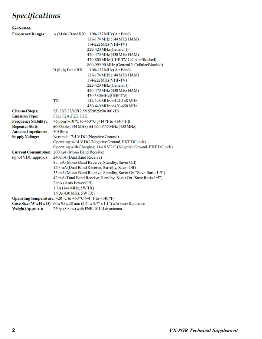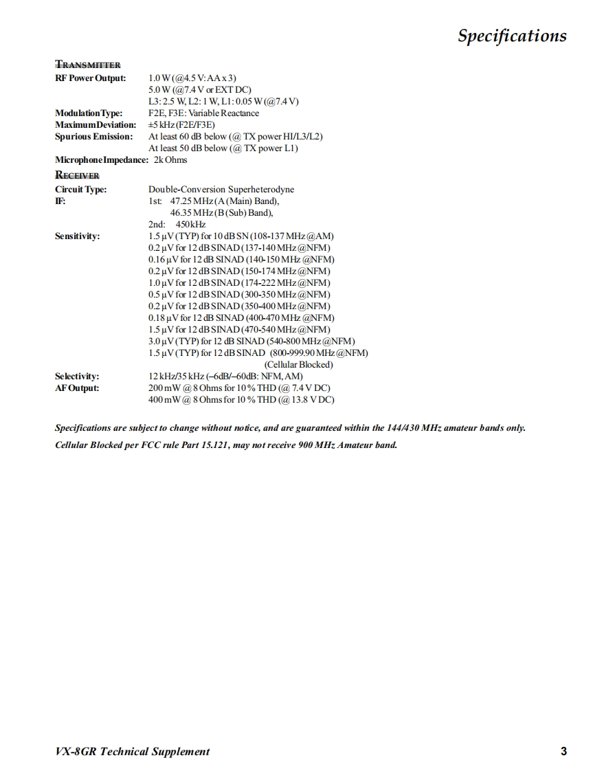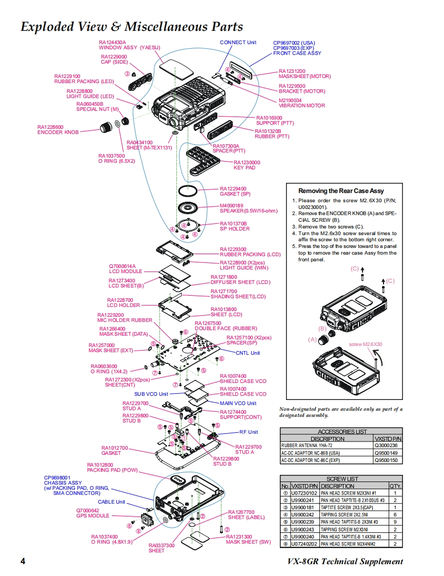 144/430MHzVERTEX STANDARD CO.,LTD.Dual-Band FM Transceiver4-8-8 Nakameguro,Meguro-Ku,Tokyo 153-8644,JapanVERTEX STANDARDwith GPSUS Headquarters10900 Walker Street,Cypress,CA90630,U.S.A.VX-8GRYAESU UK LTD.Unit 12,Sun Valley Business Park,Winnall CloseWinchester,Hampshire,S023 0LB,U.K.Technical SupplementVERTEX STANDARD HK LTD.Unit 5.20/F..Seaview Centre.139-141 Hoi Bun Road.Kwun Tong,Kowloon,Hong Kong2010 VERTEXSTANDARD CO.,LTD.Printed in Japan.VERTEX STANDARD(AUSTRALIA)PTY.,LTD.Normanby Business Park,Unit 14/45 Nomanby RoadEH041M90ANotting Hill 3168,Victoria,AustraliaIntroductionThis manual provides the technical information necessary for servicing the VX-8GR144/430 MHz Dual-Band FM Transceiver.Servicing this equipment requires expertise in handing surface-mount chip components.Attempts by non-qualified persons to service this equipment may result in permanentdamage not covered by the warranty,and may be illegal in some countries.Two PCB layout diagrams provided for each double-sided board in this transceiver.Each side of the board is referred to by the type of the majority of components installed onthat side("Side A"or"Side B").In most cases one side has only chip components,and theother has either a mixture of both chip and leaded components(trimmers,coils,electrolyticcapacitors,ICs,etc.),or leaded components only.While we believe the information in this manual to be correct,VERTEX STANDARD围assumes no liability for damage that may occur as a result of typographical or other errorsthat may be present.Your cooperation in pointing out any inconsistencies in the technicalinformation would be appreciated.Important Note1)This transceiver was assembled using Pb(lead)free solder,based on the RoHS specification.Only lead-free solder(Alloy Composition:Sn-3.0Ag-0.5Cu)should be used for repairs performed on this apparatus.The solder statedabove utilizes the alloy composition required for compliance with the lead-free specification,and any solder with the above alloycomposition may be used.2)Risk of explosion if battery is replaced by an incorrect type.Dispose ofused batteries according to the instructions.ContentsSpecification...,2Exploded View Miscellaneous Parts ..Block Diagram.Alignment1Board Unit(Schematics,Layouts Parts)RF Unit Circuit Diagram......19RE Unit Parts Layout.20RF Unit Parts List.........21CNTL Unit Circuit Diagram37CNTL Unit Parts Layout ............38CNTLUnit Parts List..39CABLE Unit Circuit Diagram ........49CABLE Unit Parts Layout.................CONNECT Unit Circuit Diagram ......50CONNECT Unit Parts Layout.....50MAIN VCO Unit Circuit Diagram...........51MAIN VCO Unit Parts Layout51MAIN VCO Unit Parts List..........53SUB VCO Unit Circuit Diagram...55SUB VCO Unit Parts Layout55SUB VCO Unit Parts List.....57VX-8GR Technical Supplement