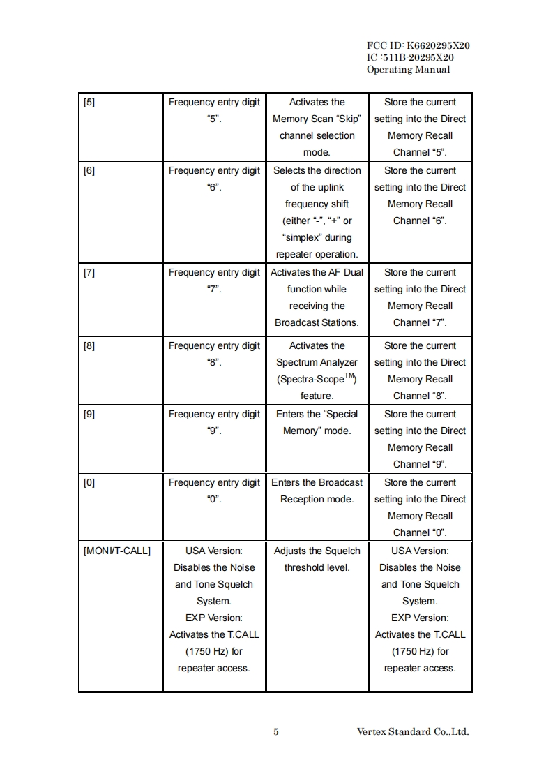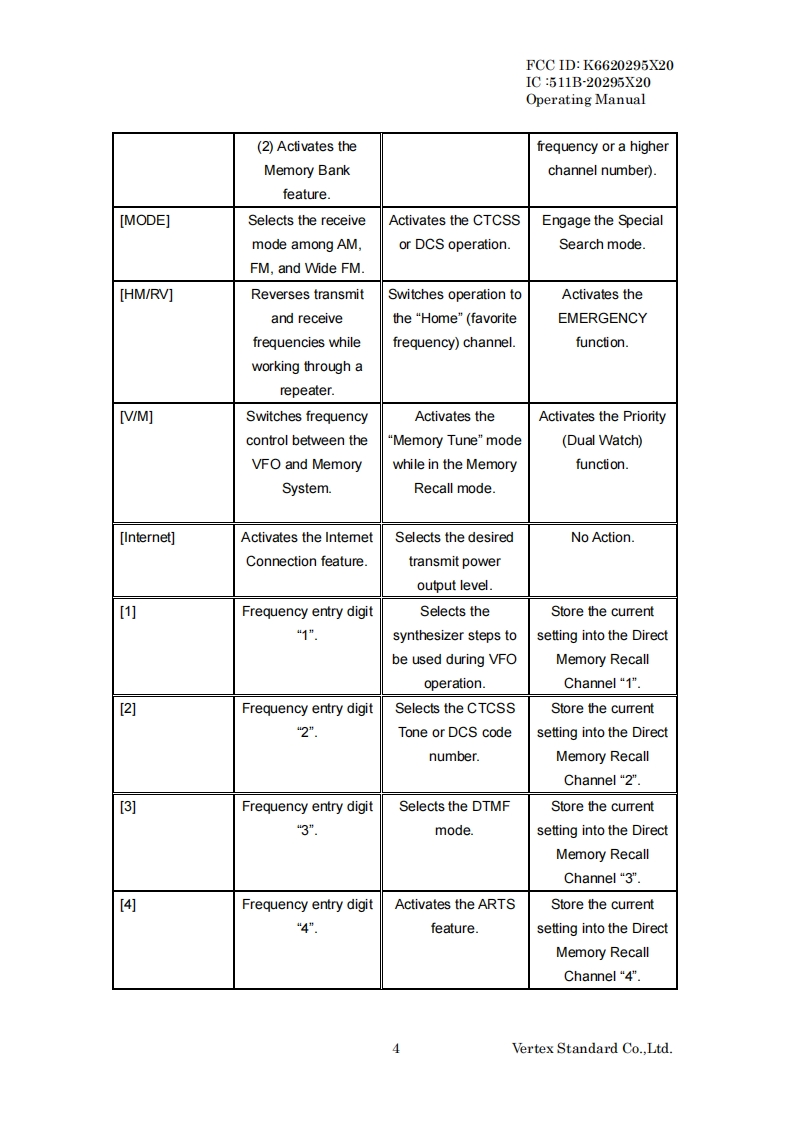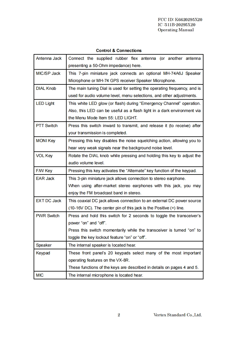 FCC ID:K6620295X20IC:511B-20295X20Operating ManualOperating ManualGeneral DescriptionThe VX-8R is a Dual Receive fourthband FM transceiver with extensive receivefrequency coverage,providing leading-edge features for VHF and UHF two-way amateurcommunications along with unmatched monitoring capability.The VX-8R's small size allows you to take it anywhere-hiking,skiing,or while walkingaround town,and its operating flexibility brings the user many avenues of operatingenjoyment.Besides 50,144,(225MHz)and 430 MHz transceive operation,the VX-8Rprovides receive coverage of the AM(MF)and FM broadcast bands,HF Shortwave Bandsup to 30 MHz,VHF and UHF TV bands,the VHF AM aircraft band,and a wide range ofcommercial and public safety frequencies!And the optional Barometer pressure Sensor Unitprovides readout of barometric pressure and altitude while mountain climbing or hiking.The transmitter section provides 5 Watts of clean power output on the FM operation onthe 50 MHz,144 MHz,and 430 MHz bands with the supplied FNB-101LI Battery Pack,and5 Watts output on 145MHz and 430 MHz,(1.5 Watts output on 225MHz)also 1.0 Wattsoutput on AM operation on 50 MHz.A wide variety of tone signaling formats are built into theVX-8R,in addition to Yaesu's exclusive ARTSTM-(Auto-Range Transponder System),which"beeps"the user when you move out of communications range with anotherARTSTMequipped station.We appreciate your purchase of the VX-8R,and encourage you to read this manualthoroughly,so as to leam about the many exciting features of your exciting new Yaesuhand-held transceiver!Front Panel Control SwitchesAntenna JackDIAL KnobMIC/SP JackLED LightPTT SwitchEAR JackMONI KeyEXT DC JackVOL KeyPWR SwitchF/W KeySpeakerMICKeypadVertex Standard Co..Ltd.