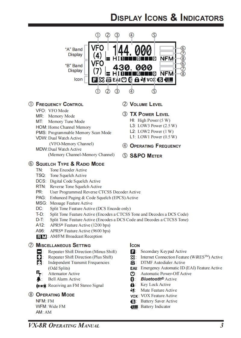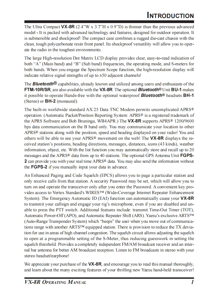 YAESU50/144/430MHzTRIPLE-BAND HEAVY DUTYSUBMERSIBLE TRANSCEIVERVX-8ROPERATING MANUALVERTEX STANDARD CO.,LTD.I YAESU4-8-8 Nakameguro,Meguro-Ku,Tokyo 153-8644,JapanVERTEX STANDARD8i,o8图US Headquarters10900 Walker Street,Cypress,CA 90630,U.S.A.SUBMERSIBLEYAESU EUROPE B.V.P.O.Box 75525,1118 ZN Schiphol.The NetherlandsYAESU UK LTD.Unit 12.Sun Valley Business Park.Winnall CloseWinchester,Hampshire,S023 0LB,U.K.VERTEX STANDARD HK LTDUnit 5,20/F..Seaview Centre,139-141 Hoi Bun Road.Kwun Tong,Kowloon,Hong Kong9ENER VX-8VERTEX STANDARD(AUSTRALIA)PTY.,LTD.Normanby Business Park.Unit 14/45 Normanby RoadNotting Hill 3168,Victoria,Australia