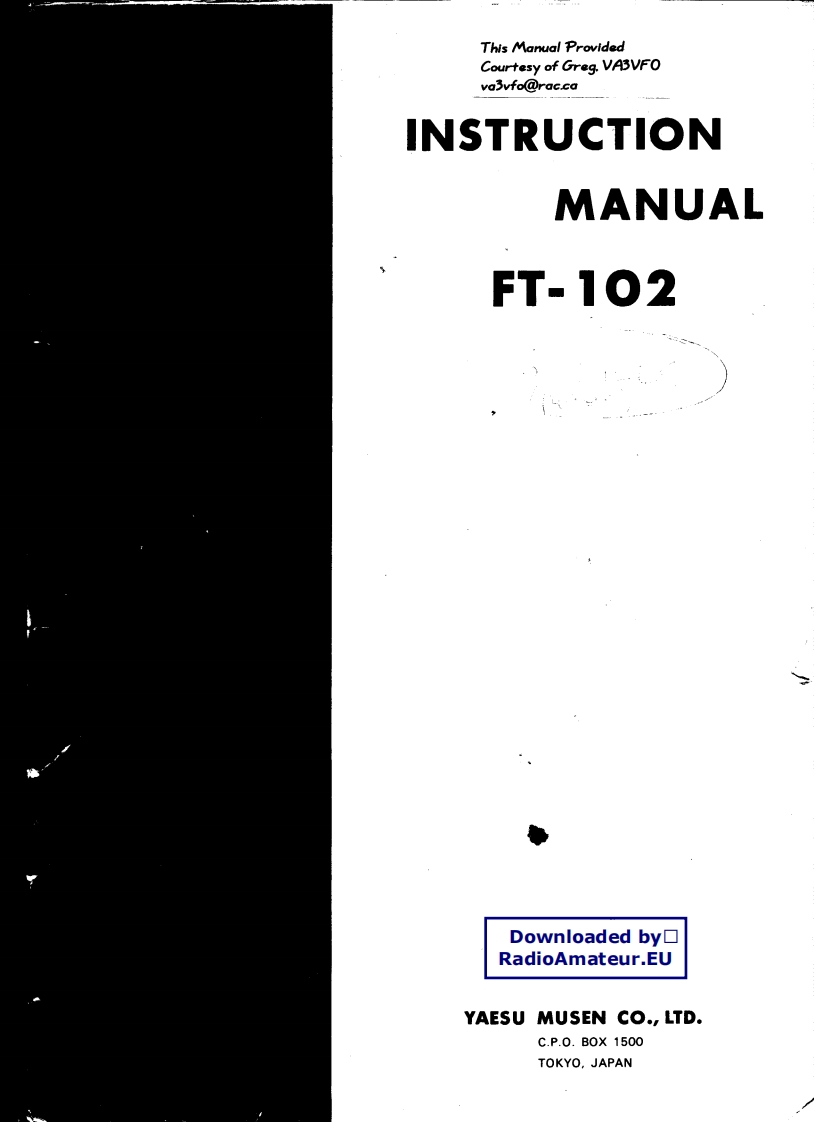 Downloaded by□Message from:Amateur Radio Station VA3VFORadioAmateur.EUGreg White,owner/operatorRe.Yaesu,Model 102 Series,Amateur Radio EquipmentGreetings from Toronto,Canada!I hope you will find the attached Yaesu manualhelpful.I have been assisted many times,by Hams whom have kindly made manualsavailable for free via mail and the Internet.I would like to take thisopportunity to now make a contribution of my own.I have noted the famous Yaesu Model 102 Series of radio equipment manuals absentfrom the Internet.I am a happy owner of a complete Yaesu 102 station and inpossession of its manuals.Hearing of many requests for the manuals,I havescanned my collection and present it to you here,free of charge.I do so withthe hope that it will assist you in keeping your own Yaesu 102 equipment runningforever and as correctly intended by the factory.I also realize how frustratingit can be trying to remember the forgotten instructions of a destroyed ormisplaced manual!I request that these files remain free for private distribution and personal useby fellow licensed Amateur Radio Operators only and that they are to beconsidered as if "on loan".No fees are to be charged for,or as a result oftheir use,nor are they to be published publicly.They are provided for privatepersonal reference only and if shared with other Hams,I ask that the credit forthe scanning and free "loan"remain with me.I look forward to your continued support of the excellent FT102 Transceiver andAccessories and helping to build both its continued demand as a "collectable"andits assured respect in Amateur Radio history.73yours truly,Greg WhiteVA3VFOToronto,CANADAva3vfo@rac.ca