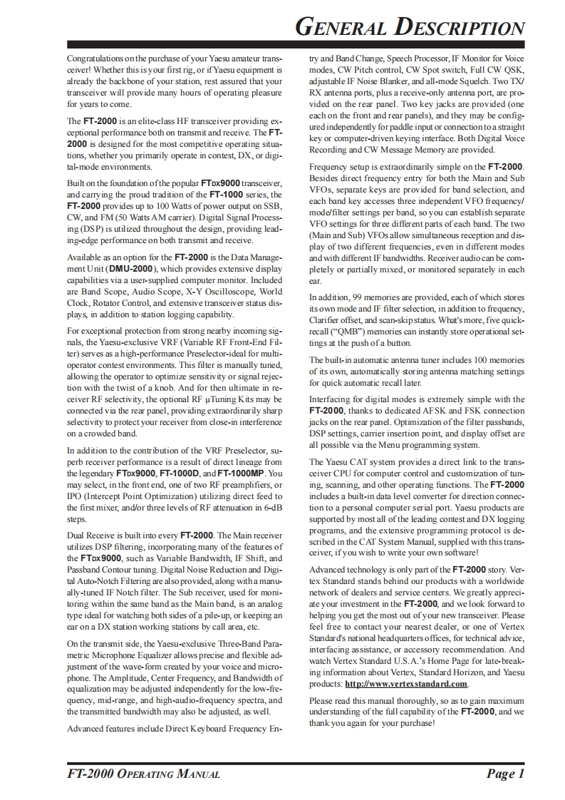YAESUHF/50 MHZ TRANSCEIVERFT-2000OPERATING MANUAL5二7495BBe00dMe FT-2000VERTEX STANDARD CO.,LTD.4-8-8 Nakameguro,Meguro-Ku,Tokyo 153-8644,JapanVERTEX STANDARDUS Headquarters10900 Walker Street,Cypress,CA 90630,U.S.A.YAESU EUROPE B.V.P.O.Box 75525.1118 ZN Schiphol.The NetherlandsYAESU UK LTD.Unit 12.Sun Valley Business Park,Winnall CloseWinchester,Hampshire,SO23 OLB.U.K.VERTEX STANDARD HK LTD.Unit 5,20/F.,Seaview Centre,139-141 Hoi Bun Road,Kwun Tong.Kowloon,Hong Kong
