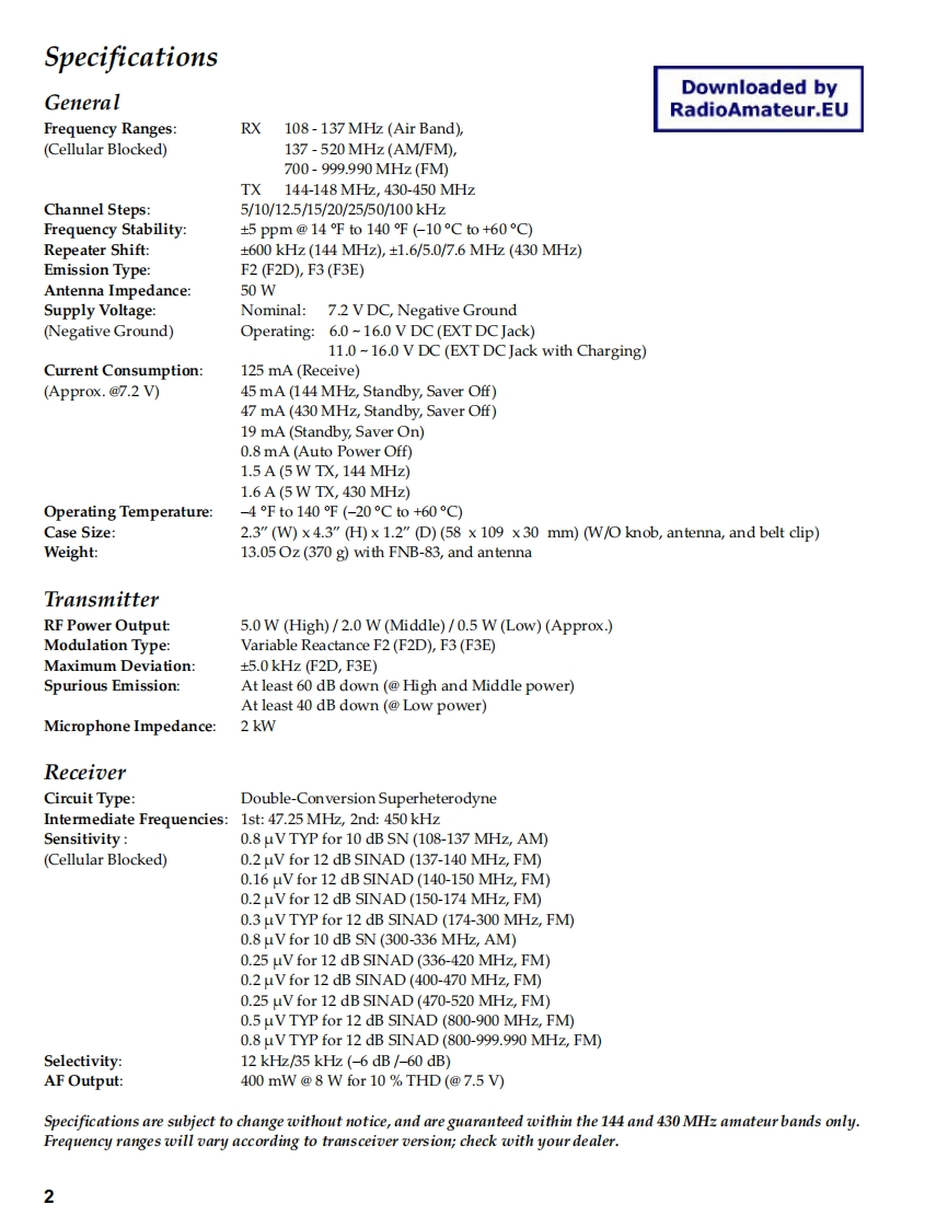 YAESUVERTEX STANDARD CO..LTD.4-8-8Nkegu,Meguro-Ku,Tokyo 153-8644,JapanVERTEX STANDARDUS Headquarters10900 Wake Street,Cypress,CA 90630.U.SA.FT-60RInternational Division8350 N.W.52nd Terrace,Suite 201,Miami,FL 33166,U.S.A.YAESU EUROPE B.V.P.O.Box 75525,1118 ZN Schiphdl,The NetherlandsYAESU UK LTD.Technical SupplementUnit 12.Sun Valley Business Park,Whnall CloseWnchester,Hampshie,S023 0LB,U.K.VERTEX STANDARD HK LTD.Unit 5.20/F..2005 VERTEX STANDARD CO.,LTD.EH017M90BDownloaded byRadioAmateur.EUIntroductionThis manual provides the technical information necessary forservicing the FT-60R VHF/UHF Dual Band Transceiver.Servicing this equipment requires expertise in handing sur-face-mount chip components.Attempts by non-qualified per-sons to service this equipment may result in permanent dam-age not covered by the warranty,and may be illegal in somecountries.YAESUTwo PCB layout diagrams are provided for each double-sidedboard in this transceiver.Each side of the board is referred toby the type of the majority of components installed on thatside ("Side A"or "Side B").In most cases one side has onlychip components(surface-mount devices),and the other has☐FM TRANSCEIVER FT-6Oeither a mixture of both chip and leaded components(trim-mers,coils,electrolytic capacitors,ICs,etc.),or leaded compo-nents only.墨While we believe the information in this manual to be correct,VERTEX STANDARD assumes no liability for damage that@可cmay occur as a result of typographical or other errors that mayAND DNw@be present.Your cooperation in pointing out any inconsisten-Ps元PSELcies in the technical information would be appreciated.ContentsSpecifications......2Exploded View Miscellaneous Parts.4Bl0 ck Diagram..…5Circuit Description..7Alignment..9Board Units(Schematics,Layouts Parts)MAIN Unit……13VR Unit.....47