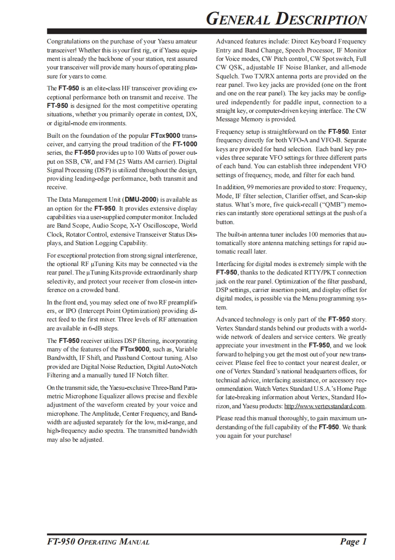 YAESUHF/50 MHZ TRANSCEIVERFT-950OPERATING MANUALFT-96·运2:2巴沿-49500■兰曾VERTEX STANDARD CO.,LTD.4-8-8 Nakameguro,Meguro-Ku,Tokyo 153-8644.JapanVERTEX STANDARDUS Headquarters10900 Walker Street.Cypress.CA 90630.U.S.A.YAESU EUROPE B.V.P.O.Box 75525,1118 ZN Schiphol,The NetherlandsYAESU UK LTD.Unit 12,Sun Valley Business Park,Winnall CloseWinchester.Hampshire.SO23 OLB.U.K.VERTEX STANDARD HK LTD.Unit 5.20/F..Seaview Centre.139-141 Hoi Bun Road.Kwun Tong,Kowloon,Hong KongVERTEX STANDARD(AUSTRALIA)PTY.,LTD.Normanby Business Park,Unit 14/45 Normanby RoadNotting Hill 3168,Victoria,Australia