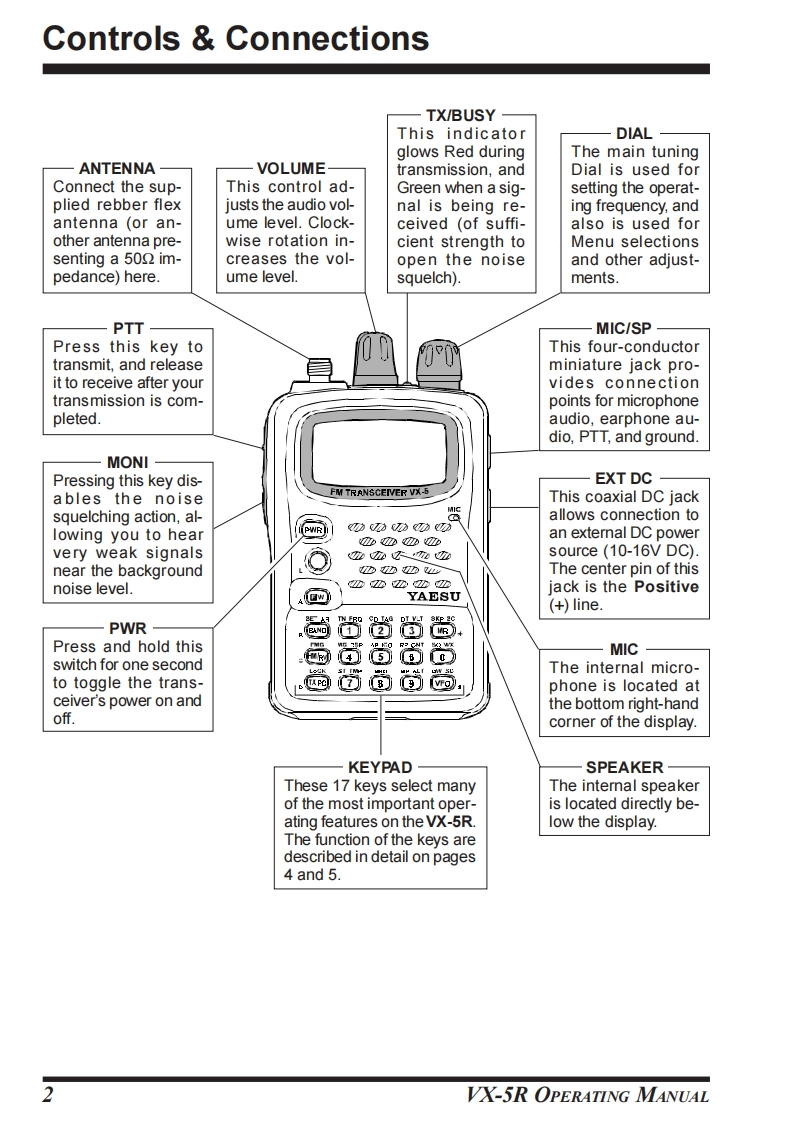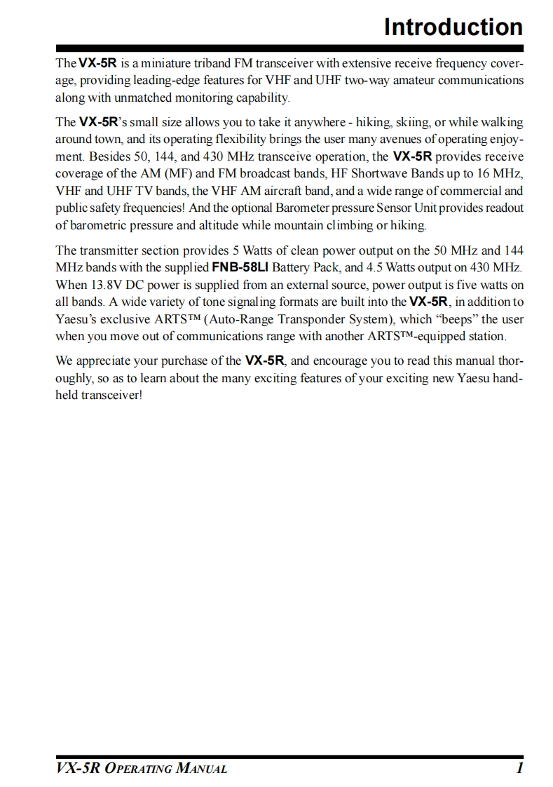 TripleYAESUBand30/144143050/144/430MHz TRIPLE-BANDHEAVY DUTY FM TRANSCEIVERVX-5ROPERATING MANUALYAESU MUSEN CO.,LTD.1-20-2 Shimomaruko,Ota-Ku,Tokyo 146-8649,JapanYAESU U.S.A.17210 Edwards Rd.,Cerritos,CA 90703,U.S.A.FM TOANSCEIVER VX-YAESU EUROPE B.V.Snipweg 3,1118DN Schiphol,The Netherlands血物边血边YAESU UK LTD.22Unit 12,Sun Valley Business Park,Winnall Trading Estate4@四YAESUWinchester,Hampshire,SO23 0LB,U.K.端简觉尚猫.YAESU GERMANY GmbH益苗诺罚Am Kronberger Hang 2,D-65824 Schwalbach,Germany尚简尚简益.YAESU HK LTD.11th Floor Tsim Sha Tsui Centre,66 Mody Rd.,Tsim Sha Tsui East,Kowloon,Hong Kong
