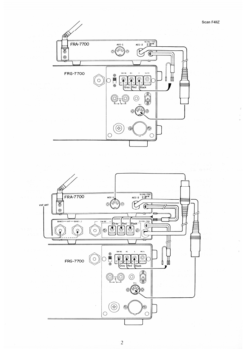 FRA-7700 ACTIVE ANTENNAScan F4lIZThis active antenna unit is designed for use with the FRG-7700general coverage receiver,allowing good quality receptionof signals while using only the attached 1.2 meter telescopingantenna.The active antenna unit includes an RF preamplifieruseful over the entire 150 kHz to 30 MHz range of the FRG-7700Its gain is adjustable from the front panel allowing precisesetting for optimum performance under a wide variety of receptionsituations.Installation and Operation1.On the end of the cable from the FRA-7700 connect the wirewith the grey tab to the SW/BC terminal on the FRG-7700,andthe wire with the red tab to the BC terminal.Similarly,connect the wire with the black tab to the E terminal onthe FRG-7700.Connect the DIN plug from the FRA-7700 to theACC jack.2.Preset the controls and switches on the FRA-7700 as follows:PREAMP-------=-ONOUT--------------SW/BCp0s1t1onGAIN------fully clockwiseBAND--------as desired3.Fully extend the telescoping antenna on the FRA-7700.4。Set the FRG-7700 to receive the desired frequency (as instep 2).5.Adjust the TUNING control on the FRA-7700 for a peak in thesignal on the receiver.If this peak occurs at either thefully clockwise or counterclockwise positions of the TUNINGcontrol,set the BAND switch to an adjacent position and tuneagain for a peak.6.Adjust the angle and position of the telescoping antennafor maximum signal.7.If a strong signal on a nearby frequency interferes with yourdesired signal,reduce the GAIN control setting to minimizethe interference.8.When you attempt to receive very weak signals on frequenciesbelow 2 MHz,set the OUT switch to the DX BC position.Note:If you have the FRA-7700 connected to the receiver andswitched OFF,such as when listening to strong localsignals or through another antenna,you may need to setthe BAND switch and TUNING control on the FRA-7700 topeak the received signal (even though the FRA-7700 isswitched off).