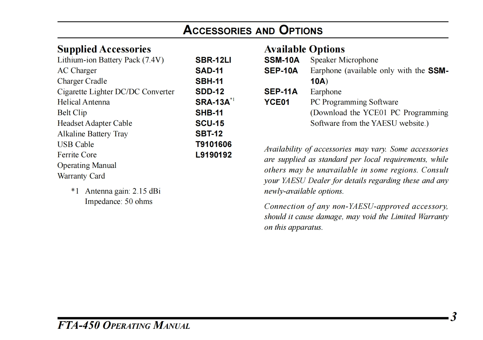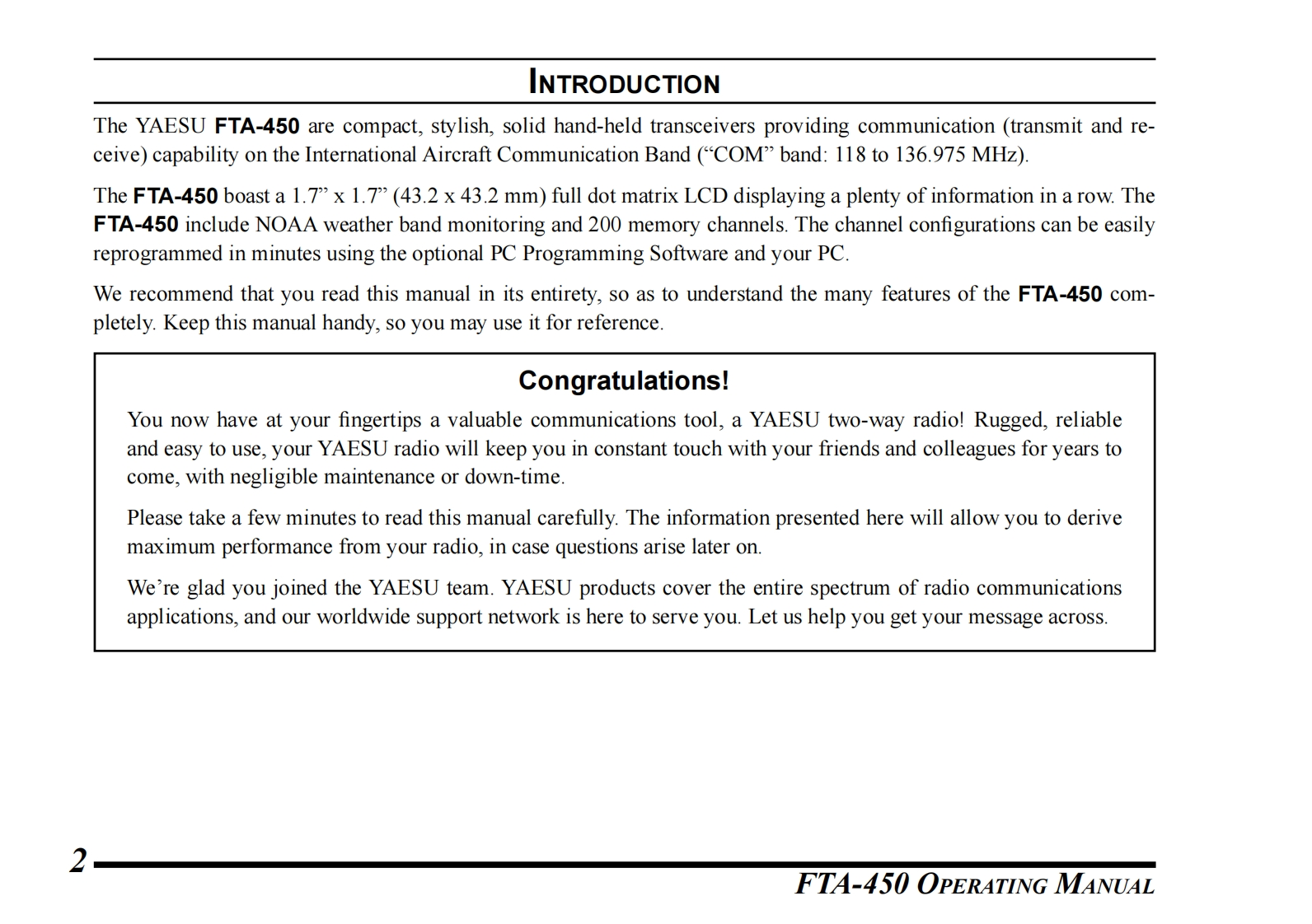 Yaesu_FTA-450_用户使用操作说明书手册找手册网33天前发布关注私信3.88MB66页032Yaesu_FTA-450_用户使用操作说明书手册此内容为付费资源,请付费后查看¥19¥21黄金会员免费钻石会员免费登录购买付费资源 第1页 / 共66页 第2页 / 共66页 第3页 / 共66页 第4页 / 共66页 第5页 / 共66页 试读已结束,还剩61页,您可下载完整版后进行离线阅读 THE END八重洲 文本预览 NAESUAIR BAND TRANSCEIVERFTA-450YAESUFTA-450Operating ManualENTMENU BACK SAVE123oMM45612157890 查看更多 收起部分 喜欢就支持一下吧收藏