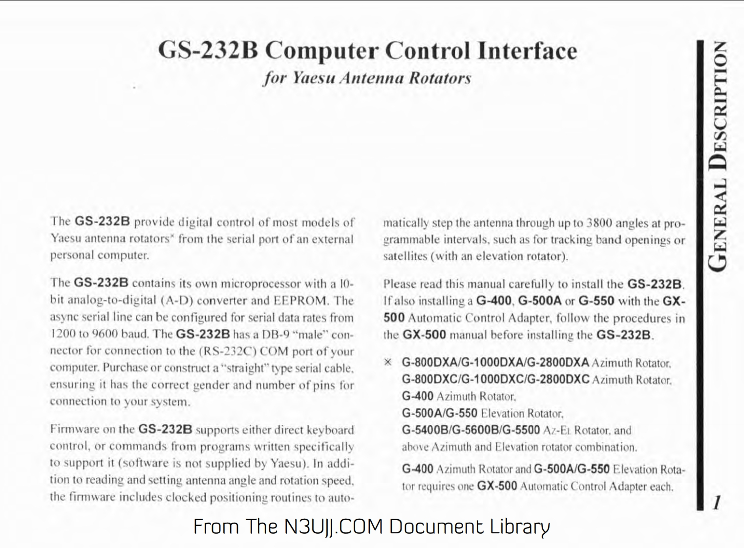 YAESUGS-232BComputer Control Interfacefor Antenna rotatorsVERTEX STANDARD CO.,LTD.YAESU4-8-8 Nakameguro.Meguro-Ku.Tokyo 153-8644,JapanCOMPUTER CONTROLLERGS-2328(POWER)VERTEX STANDARDUS Headquarters10900 Walker Street.Cypress.CA 90630,U.S.A.YAESU EUROPE B.V.P.O.Box 75525.1118 ZN Schiphol.The NetherlandsYAESU UK LTDUnit 12.Sun Valley Business Park.Winnall CloseWinchester,Hampshire.SO23 OLB.U.K.VERTEX STANDARD HK LTDUnit 5.20/F.,Seaview Centre,139-141 Hoi Bun Road.Kwun Tong.Kowloon.Hong KongFrom The N3UJJ.COM Document Library