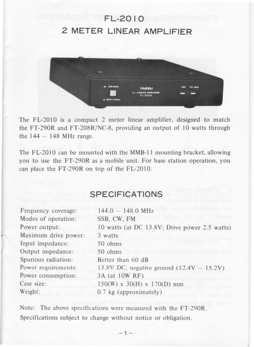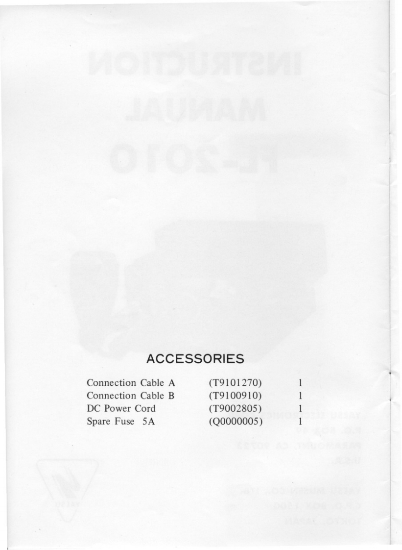 Yaesu_YaesuFL-2010_Manual操作说明书手册找手册网33天前发布关注私信3.71MB19页042Yaesu_YaesuFL-2010_Manual操作说明书手册此内容为付费资源,请付费后查看¥19¥21黄金会员免费钻石会员免费登录购买付费资源 第1页 / 共19页 第2页 / 共19页 第3页 / 共19页 第4页 / 共19页 第5页 / 共19页 试读已结束,还剩14页,您可下载完整版后进行离线阅读 THE END八重洲 文本预览 、INSTRUCTIONMANUALFL-2010YAESU ELECTRONICS CORP.P.0.B0X49PARAMOUNT,CA 90723U.S.A.YAESU MUSEN CO.,LTD.C.P.0.BoX1500YAESUTOKYO,JAPAN 查看更多 收起部分 喜欢就支持一下吧收藏