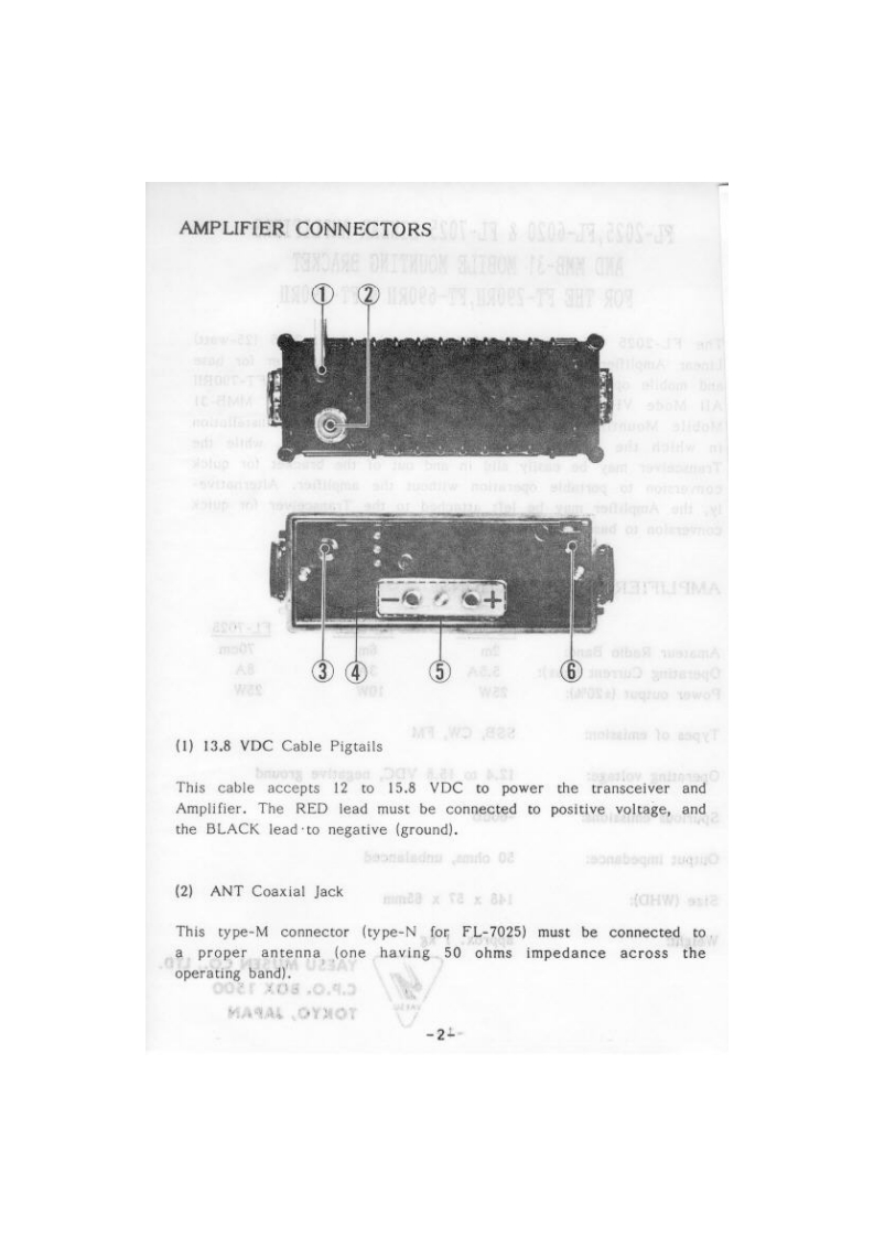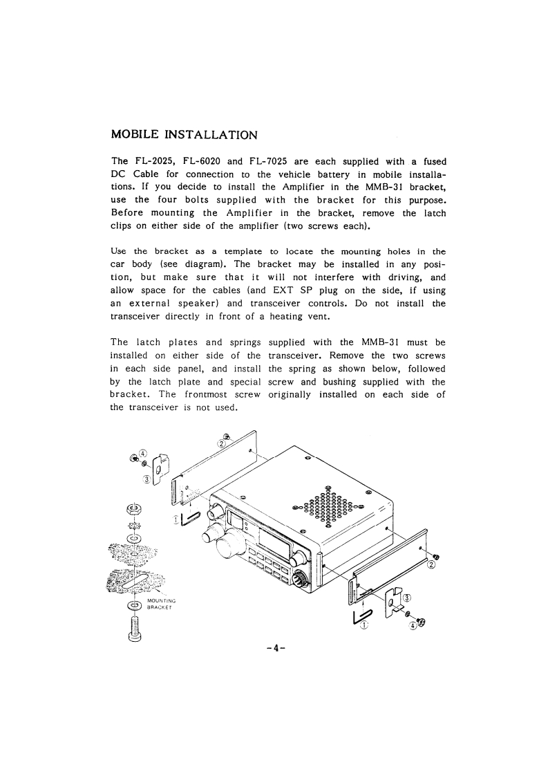 FL-2025,FL-6020 FL-7025 LINEAR AMPLIFIERSAND MMB-31 MOBILE MOUNTING BRACKETFOR THE FT-290RI,FT-690RI&FT-790RIThe FL-2025 (25-watt),FL-6020 (10-watt)and FL-7025 (25-watt)Linear Amplifiers are designed to provide increased power for baseand mobile operation with the FT-290RII,FT-690RII and FT-790RIIAll Mode VHF and UHF Transceivers,respectively.The MMB-31Mobile Mounting Bracket provides a convenient mobile installationin which the Amplifier may be installed permanently,while theTransceiver may be easily slid in and out of the bracket for quickconversion to portable operation without the amplifier.Alternative-ly,the Amplifier may be left attached to the Transceiver for quickconversion to base operation.AMPLIFIER SPECIFICATIONS:FL-2025FL-6020FL-7025Amateur Radio Band:2m6m70cmOperating Current (max):5.5A3A8APower output(±20%25W10W25WTypes of emission:SSB,CW,FMOperating voltage:12.4 to 15.8 VDC,negative groundSpurious emissions:-60dBOutput impedance:50 ohms,unbalancedSize (WHD):148x57x65mmWeight:approx.I kgYAESU MUSEN CO.,LTD.C.P.0.BoX1500TOKYO,JAPAN