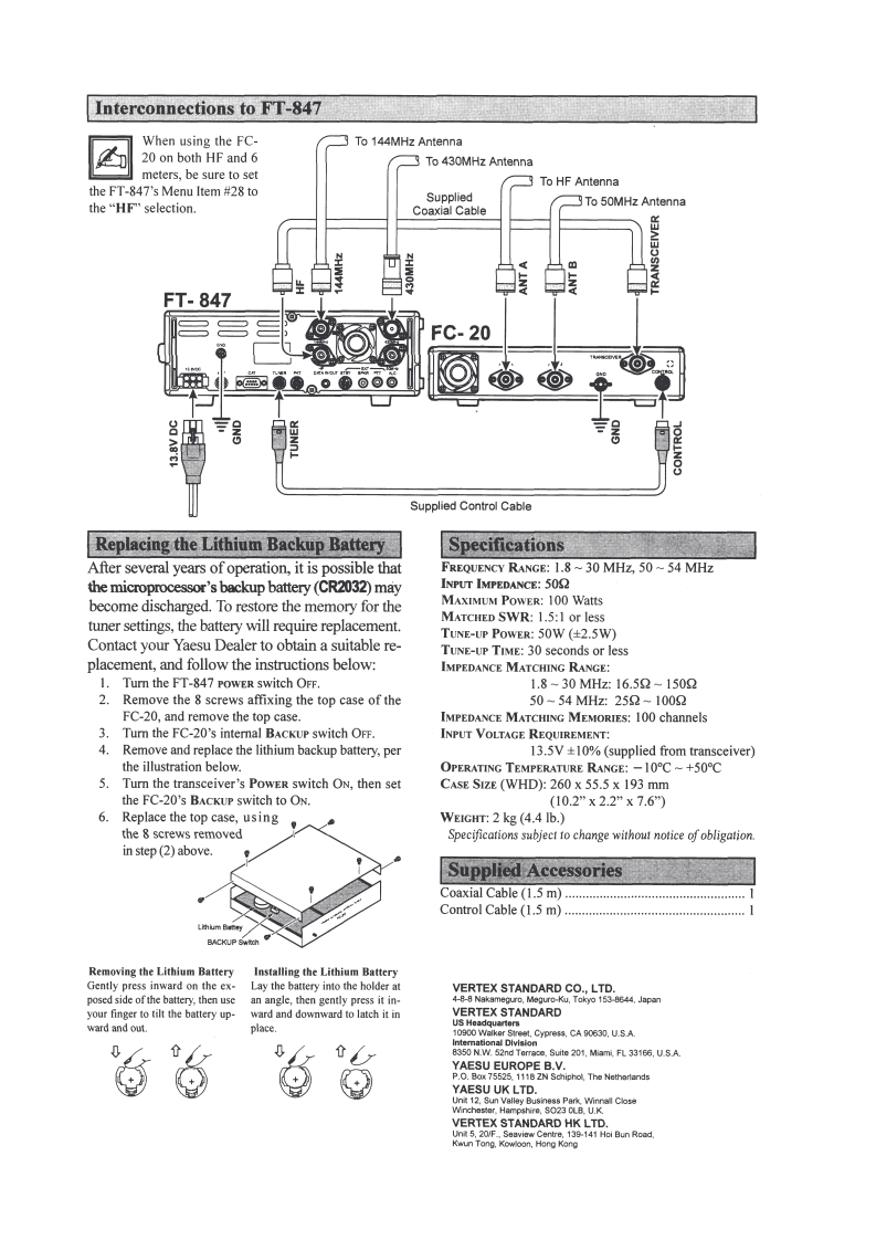 Automatic Antenna TunerFC-20Installation InstructionsThank you for your purchase of the model FC-20 Automatic Antenna Tuner,designed specifically for theFT-847 HF/VHF/UHF Transceiver.The FC-20 can accommodate two antenna inputs,and it includes acooling fan to ensure thermal stability of the critical matching elements within its compact case.The FC-20 Automatic Antenna Tuner responds to control commands from the FT-847 Transceiver,providing microprocessor-based impedance matching on the 160 through 6 meter Amateur bands.OnHF,the impedance matching range is from 16.59 to 1509 (up to 3:1 SWR),while on the 50 MHzbands the impedance matching range is 252 to 1009 (up to 2:1 SWR).Accordingly,the FC-20 shouldnot be expected to match"long wire"type antennas unless you have taken specific design steps toensure that the impedance presented to the FC-20 is within these specifications.Please refer to the FT-847 Operating Manual for operating instructions.Front/Rear Panel InformationThe PowER indicatorbecomes illuminatedYAESUwhen the ControlCable is connected be-POWER ANTERHF/50 MHz AUTOMATIC ANTENNA TUNERFC-20tween the FT-847 andFC-20 and when theFT-847's PowERswitch is turned on.FRONT PANELThe ANTENNA switch allows you to select one of two antennasconnected to the rear panel jacks.The (protruding)"A"positionof this switch selects the"ANT A"jack,while the(depressed)“B"position selects the“ANTB"jackThese"M"type("SO-239")coaxial jacks accommodateUse this"M"type("SO-239")jack for connection ofthe“A”and“B”antenna inputs for the FC-20.the interconnecting coaxial cable from the FT-847.REAR PANELTRANSCEIVERANT AANT BConnect the inter-GNDconnecting Control@:@toCable from the FT-847 to this miniature DIN connector.This is the exhaust vent for the cooling fan.For best performance and safety,which ensures thermal stability of the match-connect a good earth ground to theing elements inside the FC-20 compartment.GND lug provided.日本語①脱明甘裹面尼記載乙ōま寸.0209I-KK