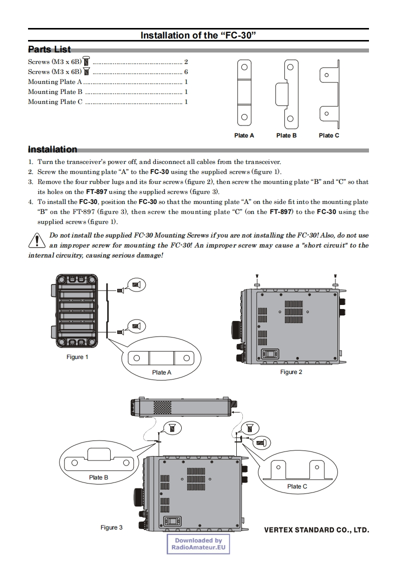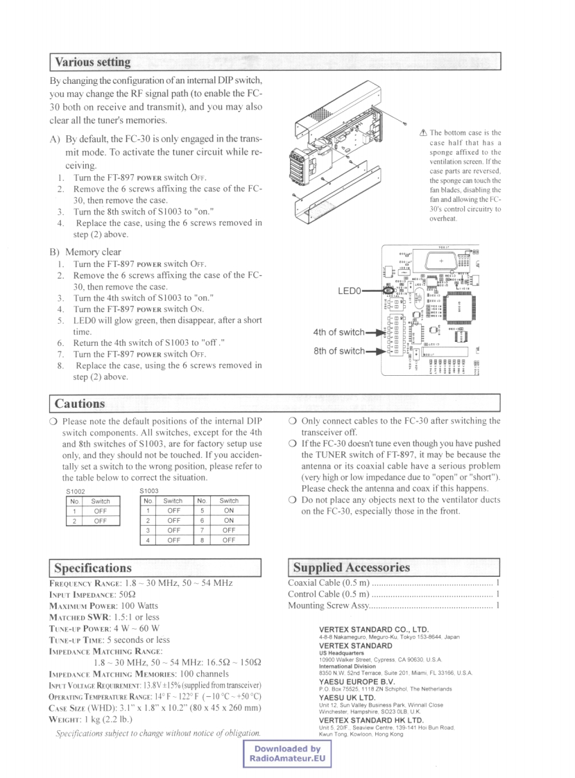 Automatic Antenna TunerFC-30Installation InstructionsThank you for your purchase of the model FC-30 Automatic Antenna Tuner,designed specifically for the FT-897HF/VHF/UHF Transceiver.The FC-30 includes a cooling fan to ensure thermal stability of the critical matchingelements within its compact case.The FC-30 Automatic Antenna Tuner responds to control commands from the FT-897 Transceiver,providingmicroprocessor-based impedance matching on the 160 through 6 meter Amateur bands.On the HF and 50 MHzbands the impedance matching range is from 16.59 to 150(up to 3:1 SWR).Accordingly,the FC-30 shouldnot be expected to match"long wire"type antennas unless you have taken specific design steps to ensure thatthe impedance presented to the FC-30 is within these specifications.Please refer to the FT-897 Operating Manual for operating instructions.Rear Panel InformationConnect the interconnecting ControlCable from the FT-897 to this min-iature DIN connector.Use this"M"type ("SO-239")jack forTRXANTThis"M"type ("SO-239")coaxial jackconnection of the interconnecting coaxialaccommodate the antenna input for thecable from the FT-897.FC-30.Interconnections to FT-897To 144MHz/430MHz AntennaControl CableTo HF/50MHz Antenna◎◎SuppliedCoaxial Cable日本語)說明甘裹面二記載乙莎志可,0210a-BKDownloaded byRadioAmateur.EU