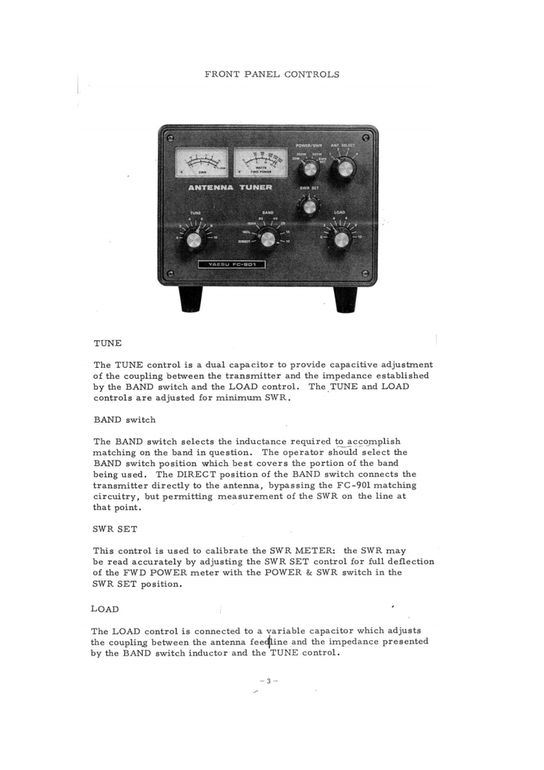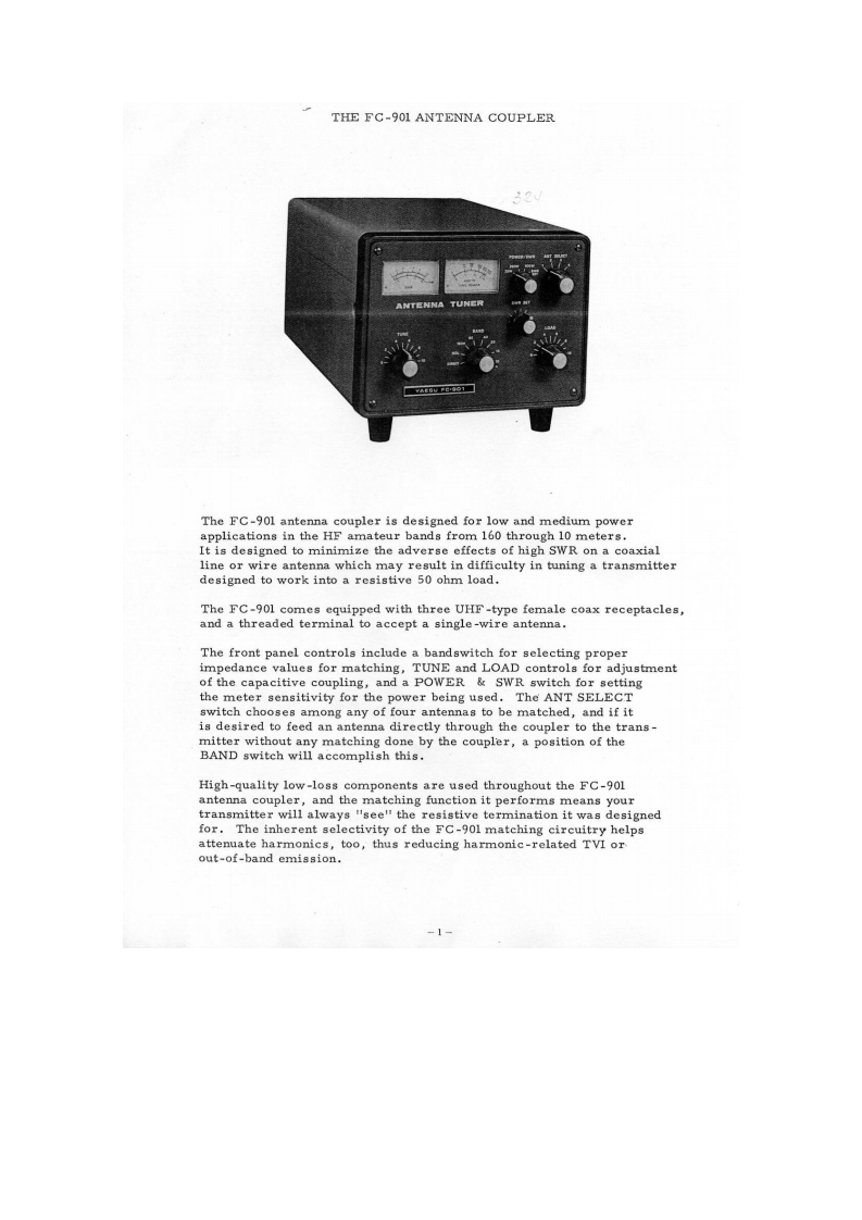 INSTRUCTIONMANUALFC-901IMPORTANT NOTEYour Yaesu equipment is backed by a warranty that guarantees your setto be free of defects.Take a few minutes to read the warranty cardcarefully.Make certain that you fill out the card completely,and mail itat once,in order to qualify for warranty service.Warranty service is to be performed by the dealer from whom the equip-ment was purchased.Do not retur the equipment to Yaesu for servicingwithout first getting a service authorization from the Yaesu Service Center.Estimates of the approximate cost to repair are available upon request.YAESU MUSEN CO.,LTD.TOKYO JAPAN