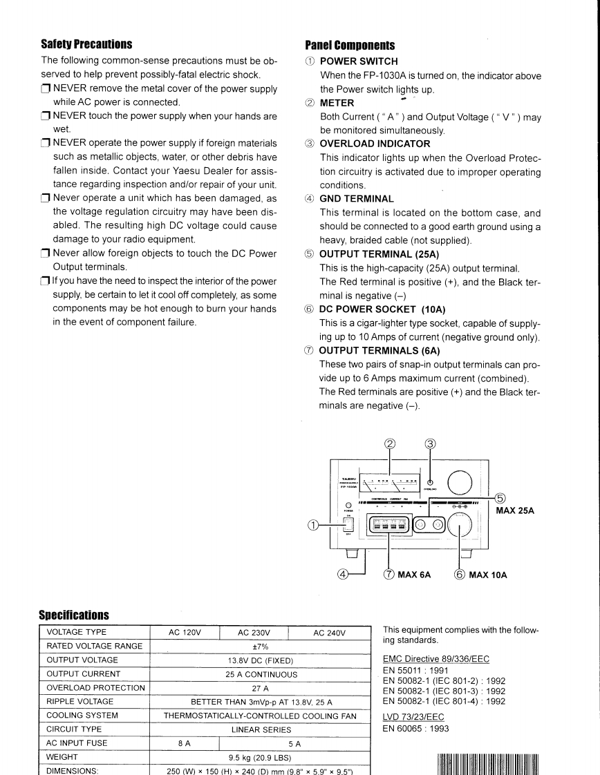 OPERATING INSTRUCTIONInstallation TipsLike any electronic apparatus,the FP-1030A should beFP.1030Ainstalled in a location which allows free air circulation,soas to provide efficient cooling for the power supply cir-cuitry.The FP-1030A should not be installed in locationsREGULATED DC POWER SUPPLYexposed to moisture,as a significant electric shock haz-INTRODUCTIONard will exist.The Yaesu FP-1030A is a high-quality,Regulated DCWe recommend that this unit not be installed in extremelyPower Supply specifically designed for use with DC pow-hot,dusty,or humid locations,nor in areas exposed todirect sunshine.ered radio equipment.The FP-1030A provides 13.8 VoltsDC at up to 25 Amps(continuous duty).Connections and OperationPlease read these operating instructions thoroughly soConfirm that the AC voltage as indicated on the rearas to ensure proper installation and utilization of this unit.panel label matches the AC mains voltage in yourWe recommend that these instructions be kept perma-area.nently for your future reference.Connect a good earth ground to the GND terminal onFeaturesthe bottom case,using a heavy,braided cable for con-☐Overload Protectionnection to your main station ground system.A current foldback circuit is utilized to prevent dam-Be sure the FP-1030A is turned OFF,then plug theage to the unit from excessive current drain.An"Over-AC cable into your station's wall outlet.load"indicator becomes illuminated when an over-Confirm the expected current drain for the radio(s)tobe connected to the FP-1030A.The two pairs of snap-load condition exists.Note:Should the overload protection circuitry be ac-in terminals can only handle a combined current of 6tivated,switch off the power supply and disconnectAmps,while the screw-on terminal can provide up to25 Amps.the external equipment immediately.Extended operation under overload conditions mayConnect each radio's Negative (usually Black)DCeventually cause damage to the power supply.cable to the appropriate Black(-)terminal on the FP-1030A,and connect each radio's Positive (usually☐High RFI ImmunityRed)DC cable to the appropriate Red (+)terminal.The FP-1030A is specifically designed for use withTurn the FP-1030A ON first,then turn on the radio(s)radio communication equipment.connected to the power supply.Operation may nowIt therefore includes extensive filtering to provide highcommenceimmunity from erratic operation which might beWhen operation is completed,turn the radio(s)OFFcaused by Radio Frequency interference(RFI).first,then turn off the power supply.Multiple DC Output connectionsBesides the two pairs of(6A)snap-in DC connec-Cautiontions and the(25A)screw-on DC output terminal,theDo not Exceed the total current rating for this powerFP-1030A features a cigar-lighter type DC output jacksupply.This unit is designed to provide a maximumfor radio equipment equipped with a hatching cigar-aggregate current of 25 Amps(total of all output ter-lighter plug.minals),Also,do not exceed a total current;drain of 6N