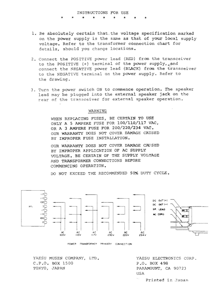 FP-12 DC POWER SUPPLYThe FP-12 power supply provides an output voltage of 13.8 DCvolts at 12 amperes,with excellent regulation.The FP-12 isdesigned for use with the FT-7B and CPU-2500R transceivers,and it includes an 8 ohm speaker for base station listening.Protection against short circuits in the power lead is provided.SPECIFICATIONSInput vo1tage:100/110/117/200/220/234vo1tsAc,50/60HzOutput voltage:13.8 volts DC (adjustable from 10-15 volt's)Output current:12 amperes,50%duty cycleCurtent limiting levei:16 amperesRipple:50 mv p-p (100 volts input,12 amps)Case size:180 (W)x 85 (H)x 290 (D)mmWeight:Approximately 7.3 kg.Specifications subject to change without notice.EP-12BROLE DIAGRAMVR.VOLTAGE SETFUSEVR E CURRENT LIMITING SET