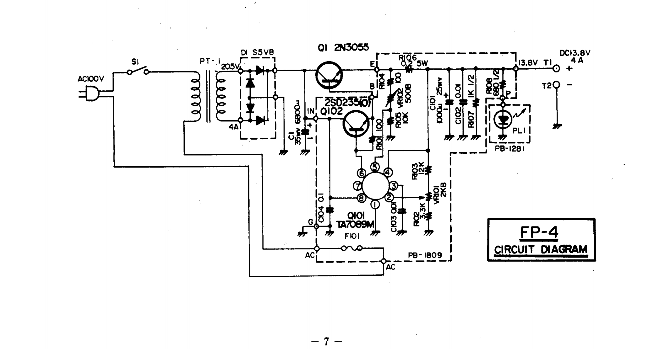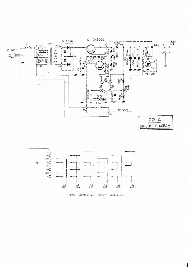 干P斗The PP-4 power supply is designed to provide Dc output of13.8 volts at.4 Amps for base station operation of the PT-7,FT-227R.or similar transceivers designed for DC operation.Ac input voltages of 100/110/117/200/220/234 at 50/60 Hzmay be used,thus allowing operation from a variety oflocations.The Fp-4 features overload and short-circuitprotection,too:current in excess of 5 Amps causes thepower supply to shut down.VR101 provides adjustment of theDC output voltage,and VR102 adjusts the current-limitingpoint of the protective circuitry.SPECIFICATIONSAC Input voltage100/110/117/200/220/234VAC50/60HzDC Output voltage13.8 v (Adjustable 10-15 v)Maximum Current4 Amps (50 Duty cycle)Current protection threshold 5 AmpsMaximum Ripple70 mv p-p 4 Amps 117 VACVR102Current limitingadjustmentvoltage adj.FUSEYAESU MUSEN CO.,LTD.C.P.O.BOX 1500 TOKYO,JAPAN