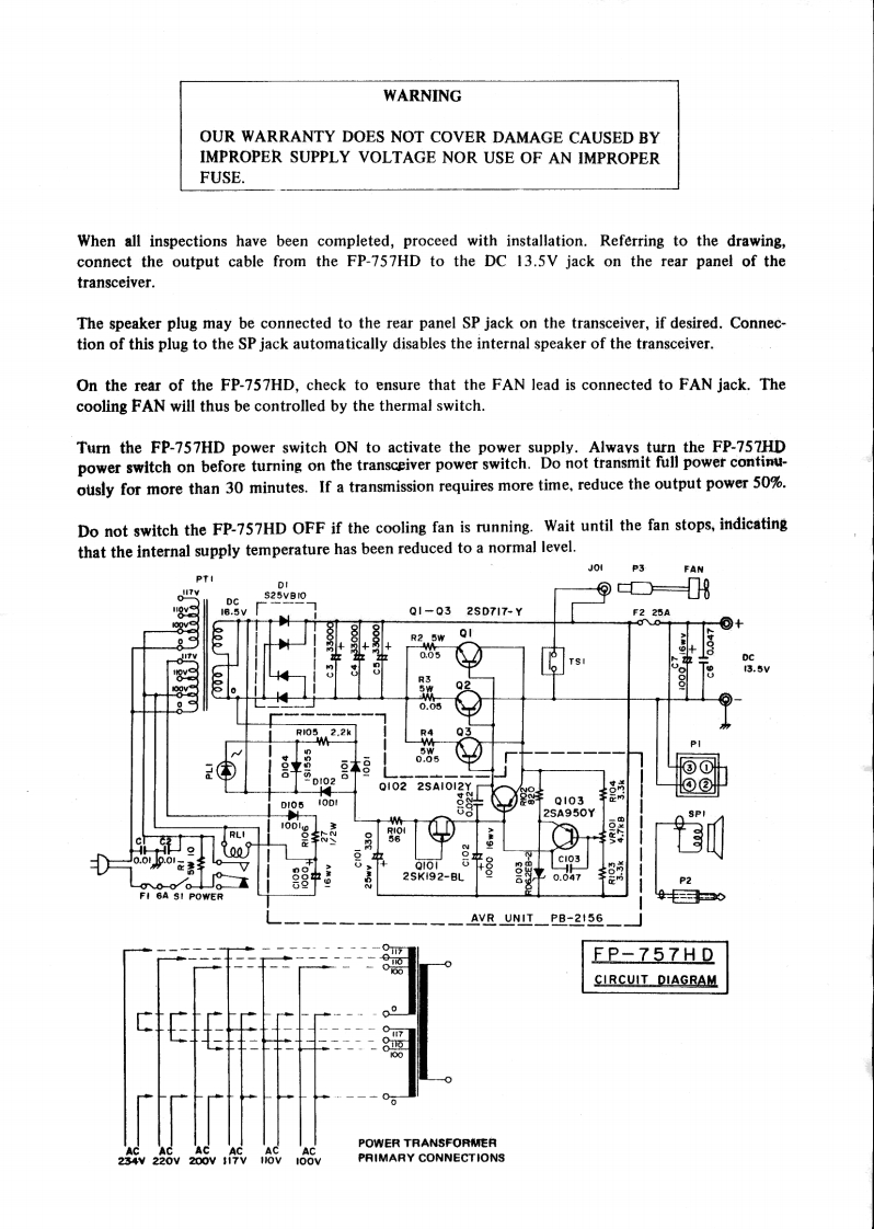 YAESU FP-757HDHEAVY DUTY POWER SUPPLYFOR THE FT-757GX HF TRANSCEIVER(ALS0FT-180,FT-180A,FT-77,FT-707)The FP-757HD is an external AC power supply and speaker for use with the FT-757GX and other HFtransceivers requiring 13.5 VDC at up to 20 amperes for extended periods.Excellent regulation and conservative design assure the owner of many years of trouble-free operation,even in heavy duty applications,such as full power AM,FM or RTTY transmission.A thermally-switched cooling fan automatically activates during long periods of high current demand,to maintainsafe operating temperature in the power supply.SPECIFICATIONS:Output voltage:13.5 VDCOutput current:20 amps extended duty cycle (30 minutes on/30 minutes off)Ambient temperature:0°to+4o°CInput voltage:100/110/117/200/220/234VAC,50/60HzCase dimensions:93(H)×240(W×235(D)mmWeight:Approx.6.9 kgSpeaker output:3 watts at 4 ohmsINSTALLATIONBefore connecting the FP-757HD to any power source,be absolutely certain that the voltage specifi-cation on the rear panel matches your local supply voltage.The FP-757HD is manufactured for usearound the world,from a variety of AC power sources,and the power transformer primary must beconnected properly as shown on the reverse side of this page to prevent damage to the internal circuity.Also,be absolutely certain to use a fuse of the proper rating.For 100/110/117 VAC,use only a6-amp fuse.For 200/220/234 VAC,use only a 3-amp fuse.757GX/SXFP-757HDDC 13.5VEXT SPAC IOOV