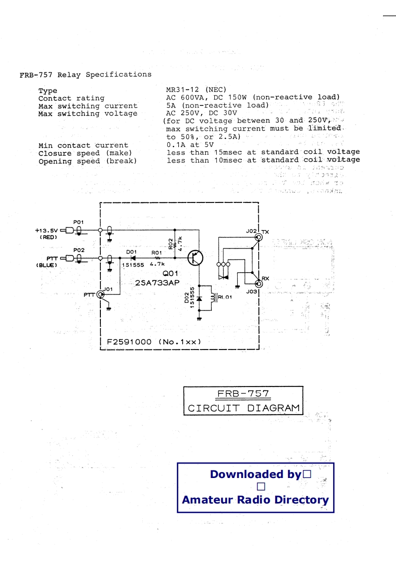 Downloaded by▣▣Amateur Radio DirectoryFRB-757 RELAY BOX FORCONTROLLING A LINEAR AMPLIFIERWITH THE FT-757GXThe FRB-757 incorporates a transistor switch and an extra heavyduty relay for controlling all types of linear amplifiers withoutendangering the delicate internal switching circuitry of theFT-757GX HF Transceiver.Full break-in (QSK)amplifiers thatrequire only 12 to 20 VDC at less than 300 mA,such as the Alpha78,can be connected directly to the FT-757GX via the BAND DATAOUT jack without using the FRB-757.However,many other amplifiersinclude T/R relays that require voltage in excess of 50V,and/orcurrent in excess of 300 mA,and these must not be connecteddirectly to the FT-757GX for T/R relay control.In such cases,or when the T/R relay requirements of the amplifier areunknown,connect the FRB-757 as shown in the diagram below.LINEAR SWITCHW OFFNON QSK LINEARSP-102PFT-757GXooooOO00O00○OOO①OOOOFP-757GXTELEPHONE LINERX PTTFR8-757LINEAR SWITCHNON QSK LINEAR口OFFT-757GXFP-757HDRX PTTFRB-757