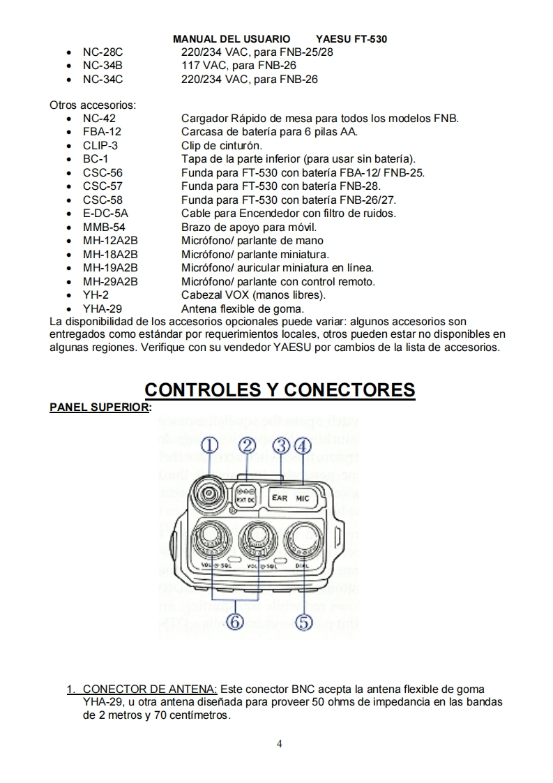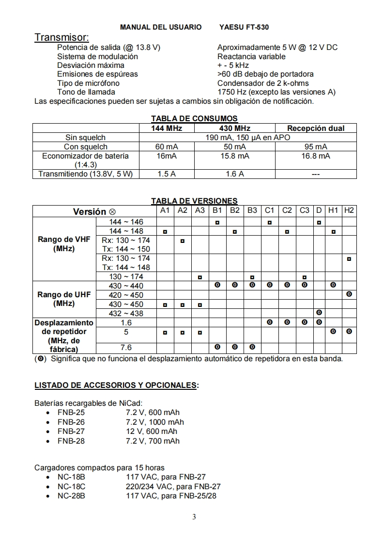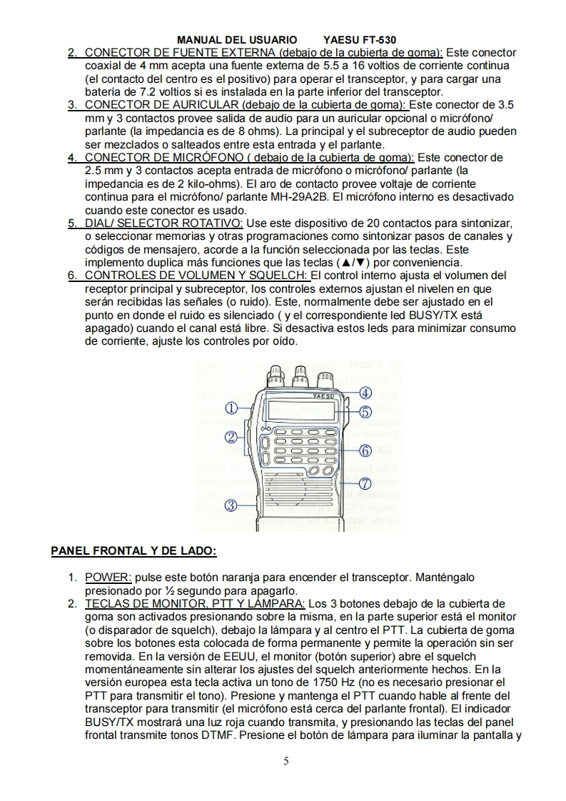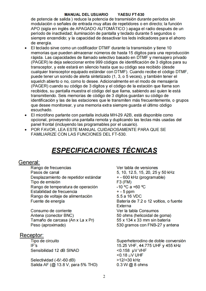 MANUAL DEL USUARIOYAESU FT-530MANUAL DEL USUARIO DEL YAESU FT-530TRADUCCION POR ALDO BARRERA,LU7HQWTRANSCEPTOR DE MANO BIBANDA EN MODO FMEI FT-530 es un transceptor de mano compacto y de lujo para las bandas de aficionado de 2metros y 70 centimetros,proveyendo de las ultimas capacidades del microprocesador dual,y de receptores separados.La potencia de transmision es seleccionable por el usuario en cuatro niveles,y hasta5 vatios(cuando es usado con la bateria de 12 voltios o la entrada exterior).EI FT-530 ofrece muchas formas de preservar la vida de la bateria.Auto discado de 10 memorias con hasta 15 digitos DTMF(sigla en ingles de MULTIFRECUENCIA DE TONOS DUALES),escaneo de CTCSS (sigla en ingles deSISTEMA DE SQUELCH CONTROLADO DE TONO CONTINUO)y una cantidad defunciones de mensajero de llamada para realizar comunicaciones en FM.La esculpida carcasa hecha en aleacion de aluminio en su parte trasera y depolicarbonato en su parte delantera,provee un grado profesional de rigidez ideal paraaplicaciones exigentes.La pantalla y el teclado traslucido tienen modos de iluminacion elegibles.La pantallaincluye lecturas duales de frecuencia de 5 digitos e indicadores para la mayoria delas funciones programables,mas fuerza de senal relativa y medidor en forma degrafico de barra para la potencia de salida en ambas bandas.La alimentacion de corriente continua se realiza mediante una entrada en la partesuperior del panel de control para alimentar el transceptor con una fuente externa,ytambien carga las baterias de NiCad de 7.2 voltios conectadas al transceptor.El facil acceso a la bateria de litio de back up es ahora posible sin tener que abrir elequipo.Un circuito de VOX con control de ganancia y retardo es incluido para el control de latransmision y recepcion con manos libres con el cabezal YH-2.Dos VFOs independientes y 41 memorias libres sintonizables por banda soncompletamente programables desde el teclado de 20 teclas;para escanearfrecuencias de transmision y recepcion independientes o desplazamientosprogramables,limitadores de subbanda por cada banda para escaneo,salto dememorias selectivo para omitir canales ocupados,modos de escaneo seleccionables.monitoreo prioritario y canales CALL en ambas bandas;todo esto es posible usandolos VFOs de la banda principal y la subbanda.Siete tamanos de pasos de canal pueden ser elegidos;y pasos de 1 MHz estansiempre disponible.El ARS sigla en ingles de DESPLAZADOR AUTOMATICO DEREPETIDORA puede ser activado para que coloque los desplazamientosautomaticamente cuando es sintonizado en las frecuencias de aficionado.Ungenerador de tono a 1750 Hz es provisto en las versiones Europeas (este boton,enlas otras versiones,es un disparador de squelch).EI CTCSS es de serie en todas las versiones,proveyendo 39 tonos subaudiblesestandar que pueden ser almacenados en las memorias independientemente.Lafuncion de campanilla de CTCSS puede ser ajustada para sonar un tono de alertacuando el tono de squelch abre,y puede escanear en un cana