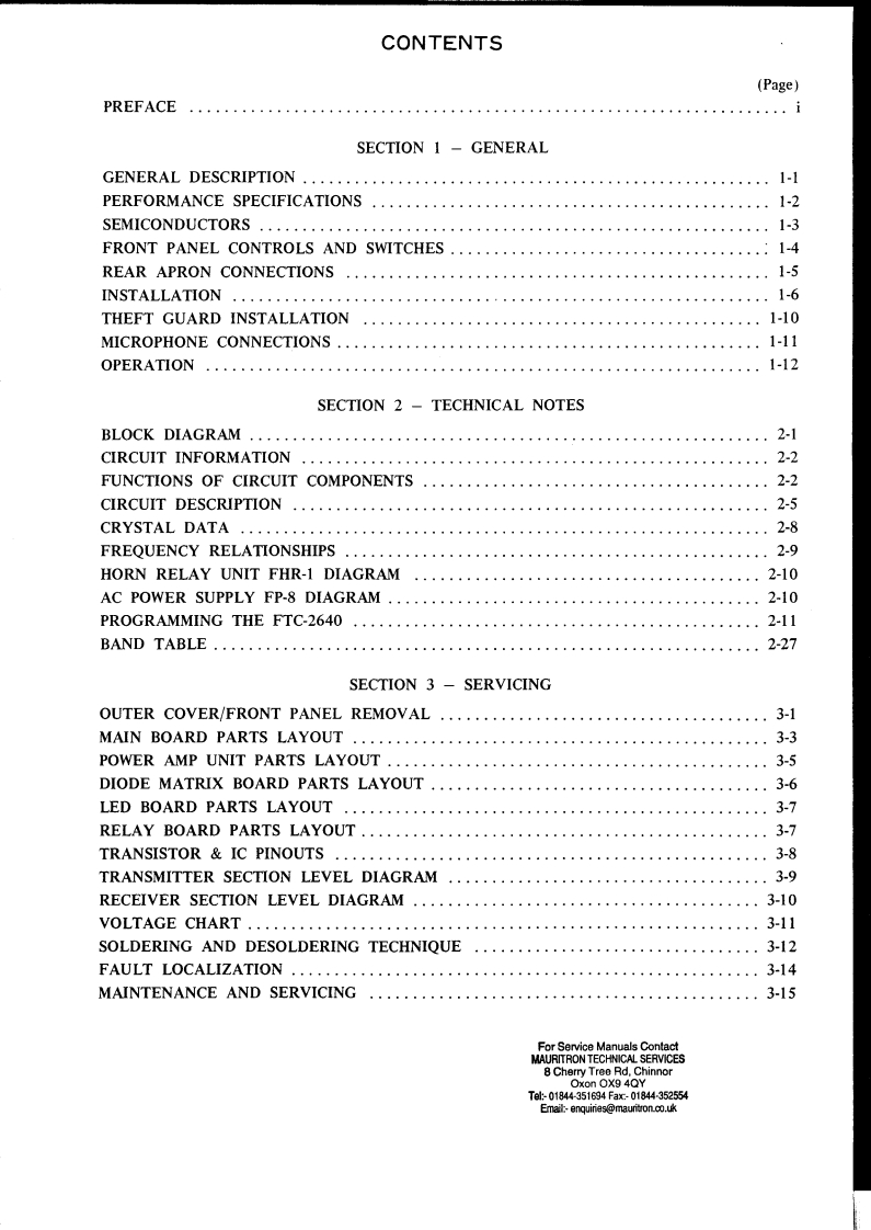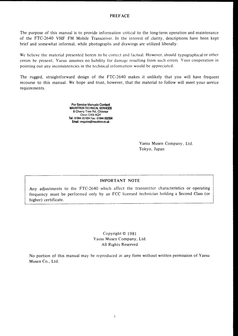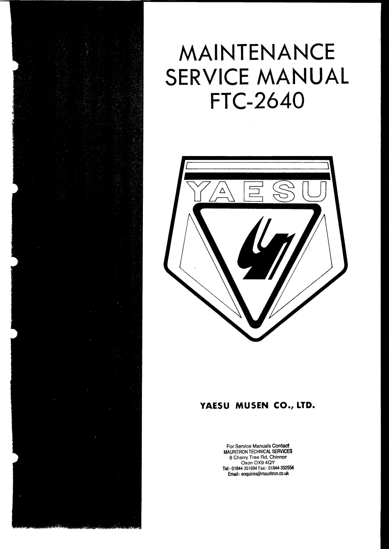 MAINTENANCESERVICE MANUALFTC-2640SAmE AsSmC 2515L8YAYAESU MUSEN CO.,LTD.For Service Manuals ContactMAURITRON TECHNICAL SERVICES8Cherry Tree Rd.ChinnorOxon OX9 4QYTek01844351694Fax01844-3525Email:-enquiries@mauritron.co.uk