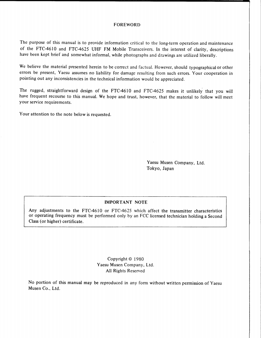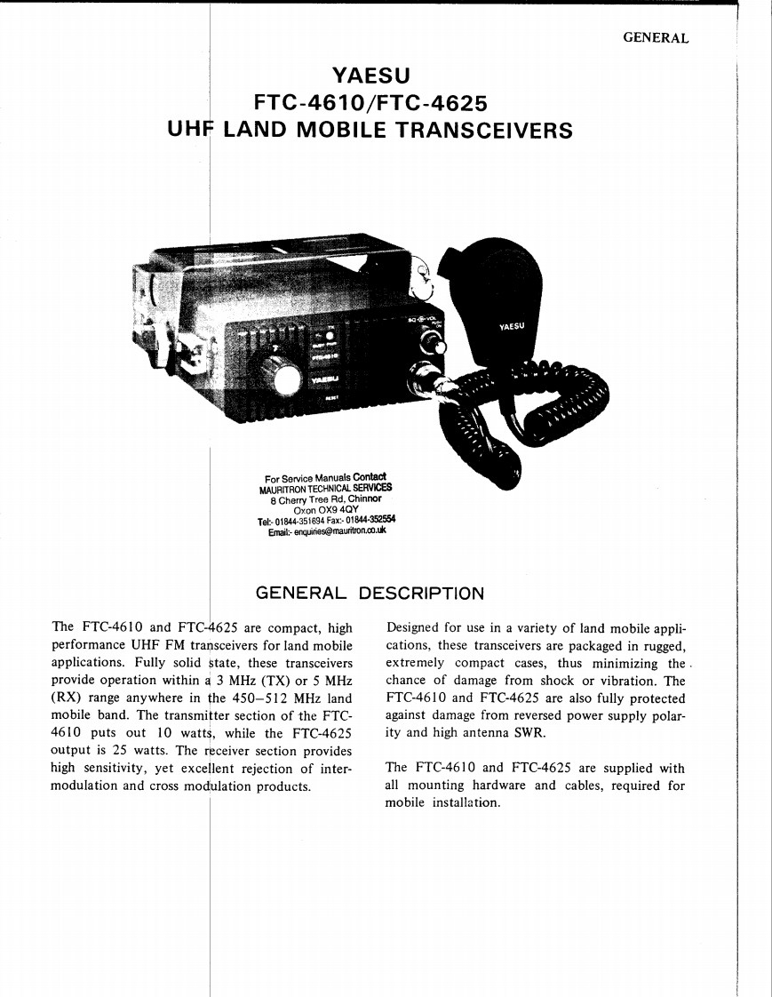 MAINTENANCESERVICE MANUALFTC-4610/4625YAESUYAESU MUSEN CO.,LTD.C.P.0.B0X1500TOKYO,JAPANMAURITRON SERVICES8 Cherry Tree Rond,ChinnorYAESU ELECTRONICS CORP.Oxfordehlre,OX9 4QY.Tel(01844)351694P.0.B0X49Fax01844)352564mauritron dial.pipex.comPARAMOUNT,CALIFORNIA,90723