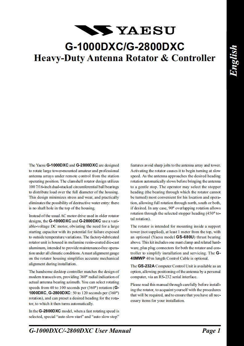 ust 3uaYAESUG-1000DXCG-2800DXCAntenna Rotator ControllerUser ManualyosinadsiSuv.VERTEX STANDARD CO.,LTD.4-8-8 Nakameguro,Meguro-Ku,Tokyo 153-8644,JapanVERTEX STANDARDUS Headquarters17210 Edwards Rd.,Cerritos,CA 90703,U.S.A.International Division8350 N.W.52nd Terrace,Suite 201,Miami,FL 33166.U.S.A.YAESU EUROPE B.V.P.O.Box 75525,1118 ZN Schiphol,The NetherlandsYAESU UK LTDWmchester HampeCosYAESU GERMANY GmbHAm Kronberger Hang 2,D-65824 Schwalbach,GermanyVERTEX STANDARD HK LTDUnit 5,20/F.,Seaview Centre,139-141 Hoi Bun Road,Kwun Tong,Kowloon,Hong Kong