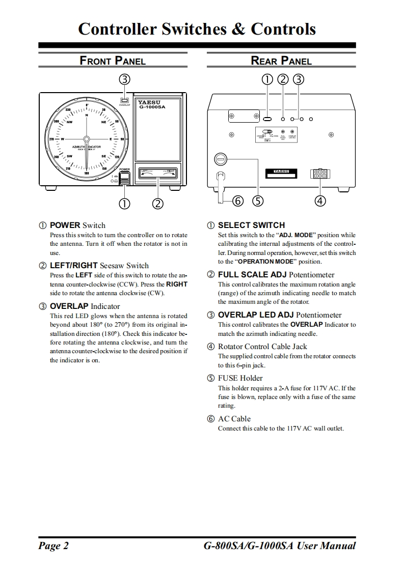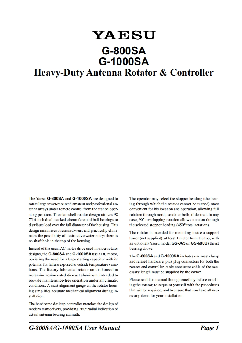 YAESUG-800SAG-1000SAAntenna rotator ControllerUser ManualgYAESUG-1000gANEOWEqVERTEX STANDARD CO..LTD.4-8-8 Nakameguro,Meguro-Ku.Tokyo 153-8644.JapanVERTEX STANDARDUS Headquarters10900 Walker Street.Cypress,CA 90630.U.S.A.YAESU EUROPE B.V.©国同P.O.Box 75525,1118 ZN Schiphol,The NetherlandsYAESU UK LTD.Unit 12,Sun Valley Business Park,Winnall CloseWinchester,Hampshire,S023 OLB,U.K.VERTEX STANDARD HK LTD.Unit 5,20/F.,Seaview Centre,139-141 Hoi Bun Road,Kwun Tong,Kowloon,Hong Kong