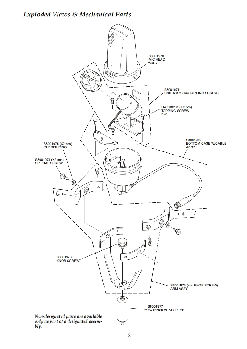 YAESUVEVEX STANDARD COTVERTEX STANDARDDESKTOP DYNAMIC MICROPHONEYAESU EUROPE B.VP.O.Bax 75525,1118 ZN Schiphol The Nethe dandsMD-200A8xYAESU UK LTD.502Technical SupplementVERTEX STANDARD HK LTD.Unt 5,20/F Seaview Centre,139-141 Hoi Bun Road,Kwun Tong.Kowbon,Hong Kong2001 VERTEX STANDARD CO.,LTD.Printed in Japan.IntroductionThe MD-200A8x Desktop Microphone is designed for base station op-eration with the latest generation of Yaesu HF transceivers,includ-ing those with VHF/UHF capability.Designed especially for ultra-low distortion and the highest fidelity,the MD-200A8x includes a new-technology "Variable Side Pressure Control"(VSPC),which allowsprecise adjustment of the microphone's audio response without re-0000000sorting to"active"equalization circuits that can introduce distortionand/or degrade signal-to-noise ratio.Servicing this equipment requires expertise in handling surface mountchip components.Attempts by unqualified persons to service thisequipment may result in permanent damage not covered by war-ranty.While we believe the technical information in this manual is correct,VERTEX STANDARD assumes no liability for damage that may oc-cur as a result of typographical or other errors that may be present.Your cooperation in pointing out any inconsistencies in the technicalinformation would be appreciated.VERTEX STANDARD reserves the right to make changes in this trans-ceiver and the alignment procedures,in the interest of technologicalimprovement,without notification of owners.SpecificationsMicrophone Element Type:DynamicFrequency Range:30-17000HzSensitivity:-62 dB (1 kHz,0 dB =1 V/1 pa)Impedance:600 OhmsDimensions(WHD):4.7"x114"x4.9(120x290.5x124.5mm)Weight:Approx.2.2 1b.(1 kg.)Specifications are subject to change without notice or obligation.
