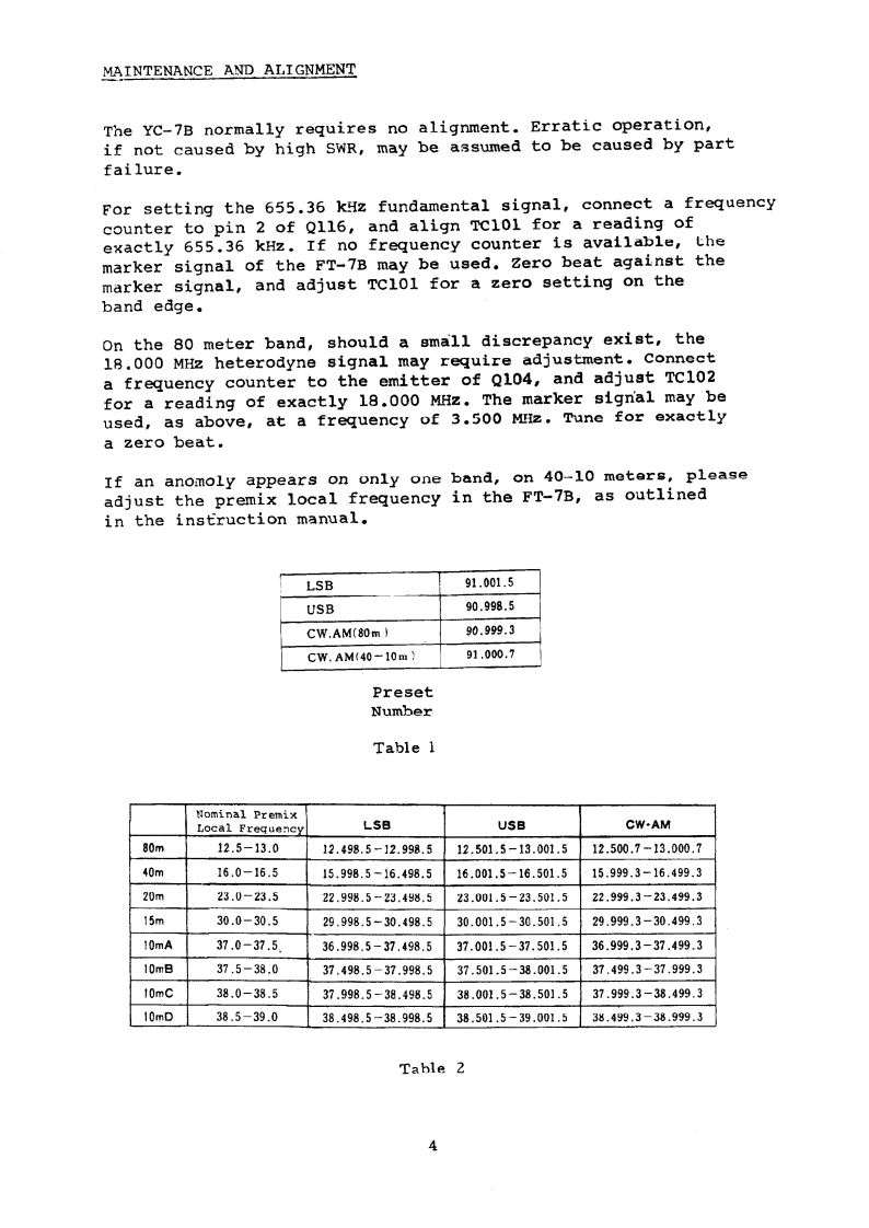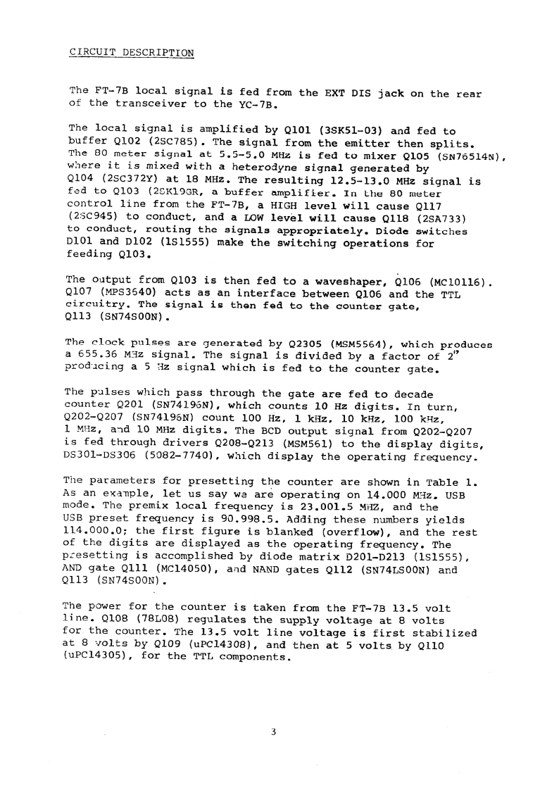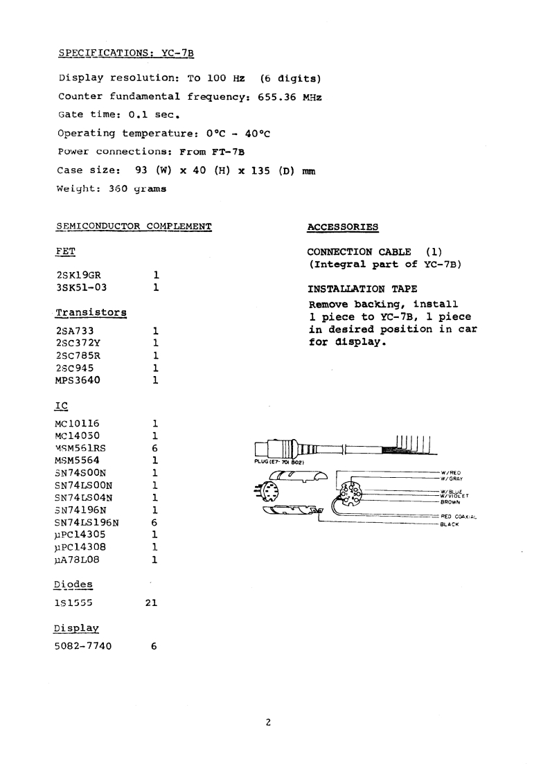 DXG1ADT9 PLAY UN甲YC-78Amateur RadioDirectory2003.02.1122:19:38+01'00Amateur RadioFirma nonverificataDirectoryWa0动,[YA∈sUYc▣GENERALThe Yc-78 digital display unit provides remote digital displayof the operating frequency,when used with the r-78 transceiver.Interconnections to the FT-7B may be completed in seconds.INSTALLATION NOTESConnect the connection cable from the YC-7B to the EXT DIs jackon the rear of the P7B.The YC-7B may be mounted in any place where convenient,subjeetto the following precautions.Extremely hot sunshine mnay causean crratic c1spldy,and inay cause part fallure.Do not score theYC-7B in the hot sunshine for any period of time.The display maybecome erratic above 75 C,and parts may fail at any temperatureabove 1200.ws121ngau2au七ama5主1 o on a aunng3ay,s1成2aa.maga过iaarother protective cover over the YC-7B,to protect it from extremesof temperature.High SwR on the antenna feedline may cause Rf currents to causean erratic display.If your antenna SwR is below 2:1,there shouldbe no difficulty encountered.Low SwR is also essential for properoperation of your FT-7B,of course.