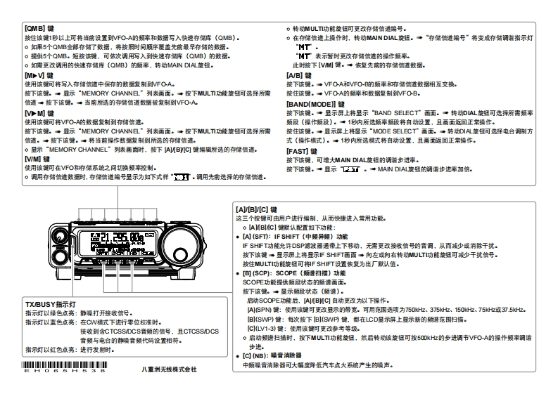 FT-891速查手册RF/SQL旋钮[PWR/LOCK灯键逆时针转动该谈钮。一将降低背景躁音和中频增益。按住该翼。一打开或关阅电台。。逆时针转动该旋钮,使电台此时的“信号强度”显示与接败的噪音电平基本一致。打开电台后,短玻该键。一打开关阅MAIN DIAL旋钮的锁定功能。。在菜单项“05-05 RF/SQL VI风”选择“S0L”,可将本功能更政为静躁控制。MAIN DIAL顺时针转动该旋钮可增大操作频率,逆时AF旋钮针转动可降低操作频率。AF旋纽(内)调节内部或外部扬声器的接收器音频音量。顺时会药恐O按下[FAST门键,可增大MAIN DIAL旋针转动可增大音量。F5R✉钮的调谐步进率。o短披【PWR/LOCK灯镜,可设定或解除DAL旋组的锁定功能。MULT功能旋钮·以500州z为步进调节VFO-A的操作颜率(AM和FM模式除外州)重复按下该旋钮直至显示“A。一转动峻钮调节频率。[CLAR]键·调节VFO-B的操作频率按下该缓。一转动MUL门功能旋纽一可将VFO-ARX干扰消除器频馋值调节到最大重复按下该旋钮直至显示“三。一转动旋纽调节频率。±9.998Hz。·操作[A]I]/C]ICLAR冈量的功能该功能适用于追踪移动的电台,或用于设置DX“异频操作中用到的A壁题认配置列F SHIFT(中频导频)功能:徽小频率偏移。按下【A个缓。+出现F SHIFTS弹出画面+转动该旋纽可调节。按下MULT功能旋钮1秒以上,可将干扰消除器频馋值(频率)复位至“0(零)”。DSP滤波器通带。。按住该旋钮可将F SHIFT设置族复为出厂默认值。·选择所需存储信道显示“MEMORY CHANNEL”列表西面时,可通过转动并按[F]键按下该境。一按如下顺序切换“设置功能”模式下该旋钮选择所需存储道。·通过“设置/功能”模式打开或关闭功能功能1+功能2+CW设置+在被下月缓后显示的“设置功能”模式上,转动该旋钮可进。在“设置功能”模式下选择所需功能,然后按MULT功能旋组打开或关闲该功能。行操作。。将“设置功能”模式配置到AM®©缓,在“设置/功能”模式下转动MULT门功能旋钮迭择所需功能,然后按·迭绎菜单(转动该旋钮)住IAB回Mc镜。,打开或关阅功能(铍下该旋纽)0使用菜单项“0510°、“0511”或“0512”可启动FM设置、REC设置和ATAS设置功能西面。,更改设定值(按下该旋钮并转动)更政菜单模式设定值按往该镜。一启动菜单模式。
