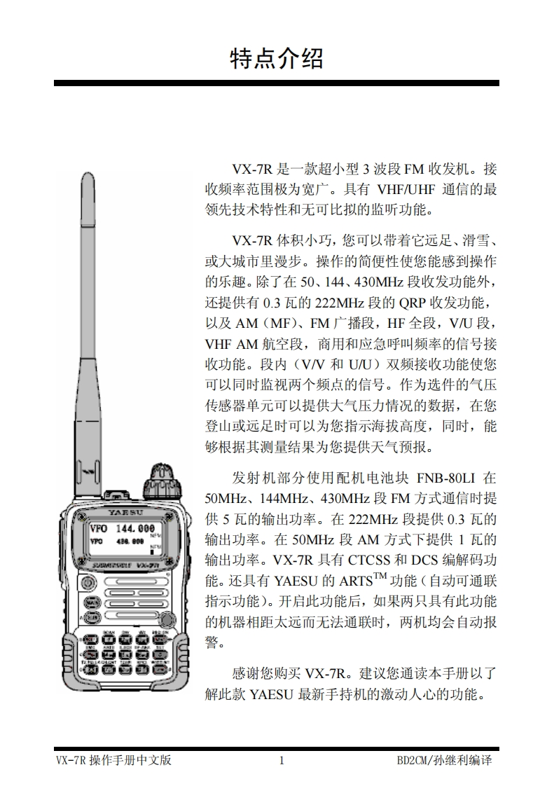 编号3:八重洲YAESU-VX-7R操作说明书手册中文找手册网32天前更新关注私信1.23MB85页053编号3:八重洲YAESU-VX-7R操作说明书手册中文此内容为免费资源,请登录后查看¥0 登录查看免费资源 第1页 / 共85页 第2页 / 共85页 第3页 / 共85页 第4页 / 共85页 第5页 / 共85页 该文档为免费文档,您可直接下载完整版进行阅读 THE END八重洲 文本预览 YAESU50/144/430MHz超小型三频段防水电台VX-7R操作手册BD2CM/孙继利编译BG2YF/马玉成整理 查看更多 收起部分 喜欢就支持一下吧收藏