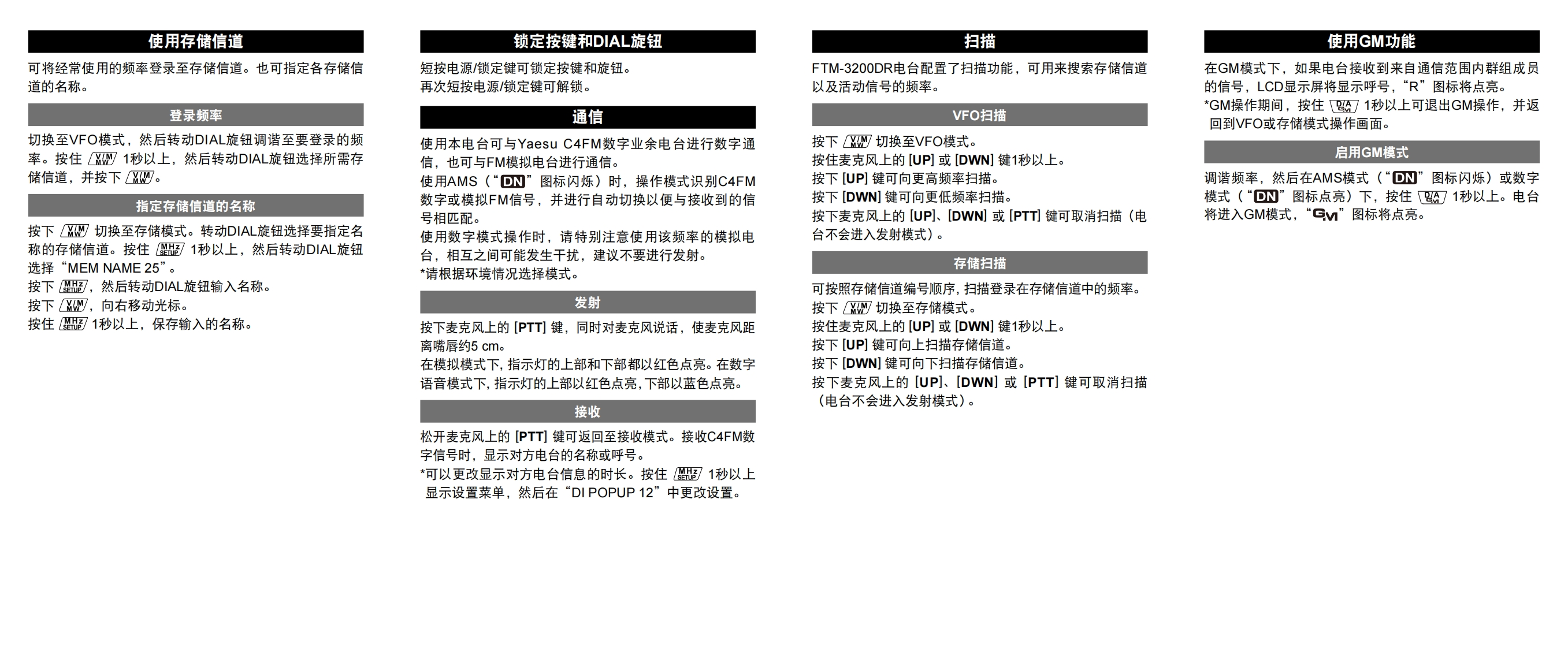 FTM-3200DR输入更改呼号返回至操作画面选择通信模式速查手册C4FM/FM按住图1秒以上,可从设置菜单返回至操作画面。输入呼号正常使用时,请在AMS模式下操作电台(“DN”图标闪补充·按下图可返回至上一画面。烁)。操作模式根据接收的信号自动切换为相匹配的模2购买后第一次打开本电台或复位后,将显示输入呼号的,按住图1秒以上可返回至操作画面。式。画面。按下可手动切换通信模式。恢复默认设置(全部复位)“FM(不显示图标)”障“AMS(“DN”图标闪烁)”牌“DN"6.520d可将电台全部设置和存储内容恢复至默认设置。(“DN”图标点亮)”ENTER CR关闭电源,按下、图和的同时,打开电源。DN:在数字语音信号发射期间,检测和校正语音信号,显示“ALL RESET PUSH V/M KEY”时,松开按键。减少呼叫中断。按下四可复位。FM:使用FM模式进行模拟通信。在数字模式下,信号微按下M四,然后转动DIAL旋钮输入呼号。弱且音频易中断时有效。调节音量按下四,向右移动光标。顺时针/逆时针转动VOL旋钮可调整音量等级。更改发射功率等级按住图1秒以上,登录呼号。1VOL旋钮补充转动DAL旋钮,字符按如下顺序切换:按住1秒以上,然后转动DIAL旋钮选择发射功率等2LCD显示屏空格”啤“”“”◆0至9一A至乙调谐频率级。3DIAL旋钮注意,第一个字符不可以使用“空格”、“”和“”。按下M四切换至VFO模式,然后转动DIAL旋钮。“HIGH”啤“LOW”W“MID4电源/锁定键按下图使频率的前3位数字闪烁,然后转动DIAL旋钮按下忍,设置发射功率等级。5VMMW键(YW)更改呼号可以1MHz为步进设置频率。6 MHz SETUP键(图)可从设置菜单更改呼号。7D/AGM键(A)按住图1秒以上,然后转动DIAL旋钮选择“MY CALL8 REV DW键()53”,并按下3图,转动DIAL旋钮选择所需字符。按下9 SQL TXPO键(s8)四,向右移动光标。输入呼号后,按住图1秒以上。10外接MIC插孔EH052N538