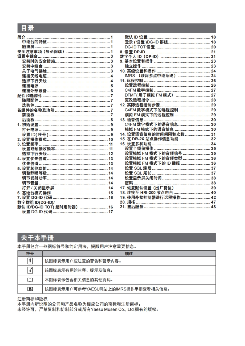 手册编号65:YAESU-DR-2X用户使用操作说明书手册找手册网33天前更新关注私信13.07MB52页035手册编号65:YAESU-DR-2X用户使用操作说明书手册此内容为免费资源,请登录后查看¥0 登录查看免费资源 第1页 / 共52页 第2页 / 共52页 第3页 / 共52页 第4页 / 共52页 第5页 / 共52页 该文档为免费文档,您可直接下载完整版进行阅读 THE END八重洲 文本预览 YAESUVHF/UHF C4FM/FM50WAMS数字中继台DR-2X操作手册T把元AB 查看更多 收起部分 喜欢就支持一下吧收藏