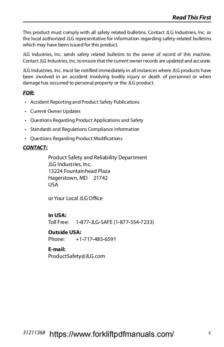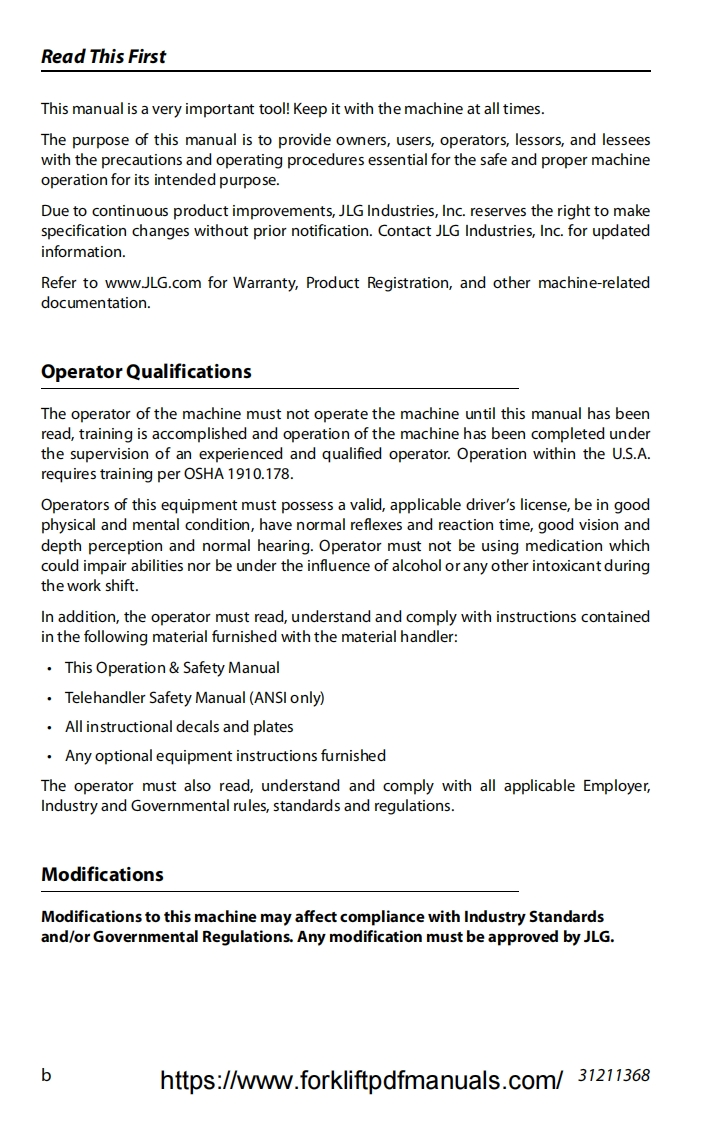 JLG-742-943-1043-1055-1255-Telehandlers-Operators-Manual-PDF操作说明书手册找手册网昨天发布关注私信19.98MB254页047JLG-742-943-1043-1055-1255-Telehandlers-Operators-Manual-PDF操作说明书手册此内容为付费资源,请付费后查看¥19¥21黄金会员免费钻石会员免费立即购买您当前未登录!建议登陆后购买,可保存购买订单付费资源 第1页 / 共254页 第2页 / 共254页 第3页 / 共254页 第4页 / 共254页 第5页 / 共254页 第6页 / 共254页 第7页 / 共254页 第8页 / 共254页 第9页 / 共254页 第10页 / 共254页 试读已结束,还剩244页,您可下载完整版后进行离线阅读 THE ENDJLG 文本预览 GOperation SafetyManualOriginal InstructionsKeep this manual with machine at all times.Models742,943,1043,1055,1255PVC1911,200531211368May 5,2020-Rev BANSIGAn Os hkosh Corporation Compar 查看更多 收起部分 喜欢就支持一下吧收藏