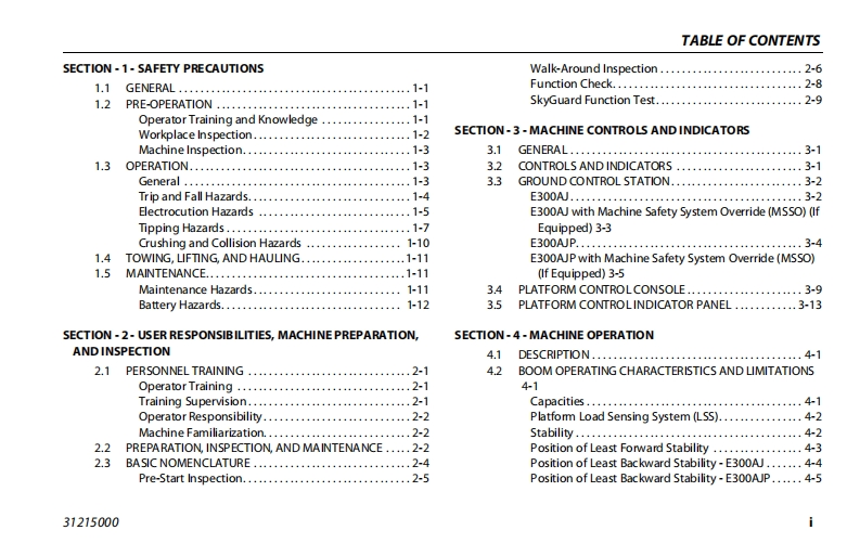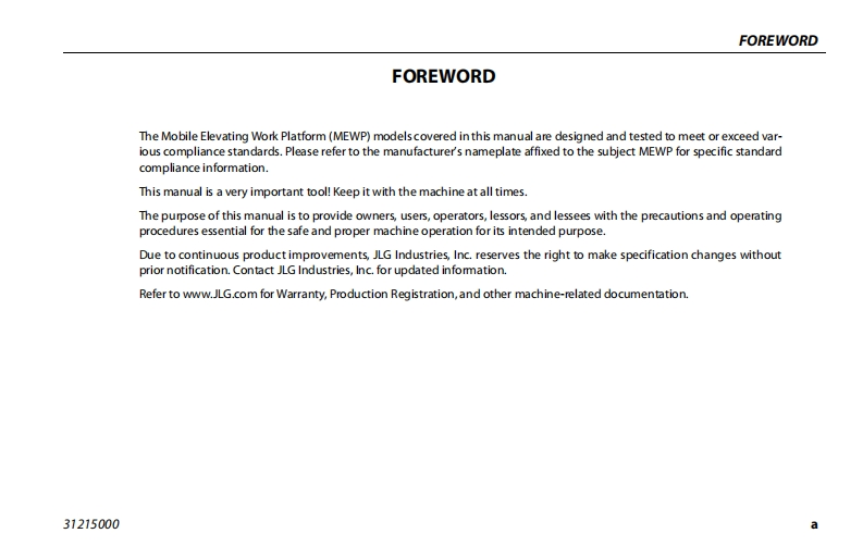 JLG-E300AJP-Operations-Manual操作与维护保养说明书手册找手册网昨天发布关注私信7.52MB110页039JLG-E300AJP-Operations-Manual操作与维护保养说明书手册此内容为付费资源,请付费后查看¥19¥21黄金会员免费钻石会员免费立即购买您当前未登录!建议登陆后购买,可保存购买订单付费资源 第1页 / 共110页 第2页 / 共110页 第3页 / 共110页 第4页 / 共110页 第5页 / 共110页 第6页 / 共110页 第7页 / 共110页 第8页 / 共110页 第9页 / 共110页 第10页 / 共110页 试读已结束,还剩100页,您可下载完整版后进行离线阅读 THE ENDJLG 文本预览 GAn Oshkosh Corporation GompanyOperation and Safety ManualOriginal Instructions-Keep this manual with the machine at all times.ModelsE300AJE300AJPPVC2001ANSI C∈③AS/NZS31215000September 28,2020-Rev B 查看更多 收起部分 喜欢就支持一下吧收藏