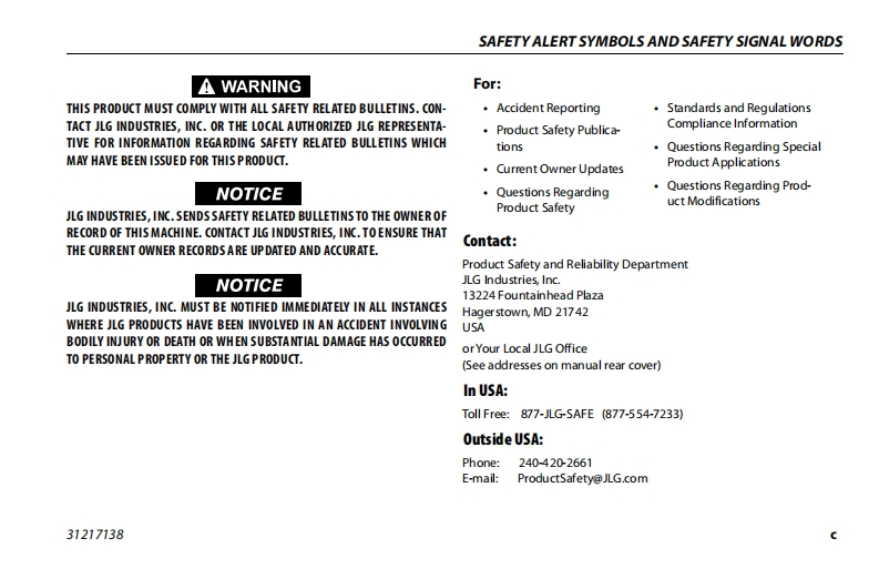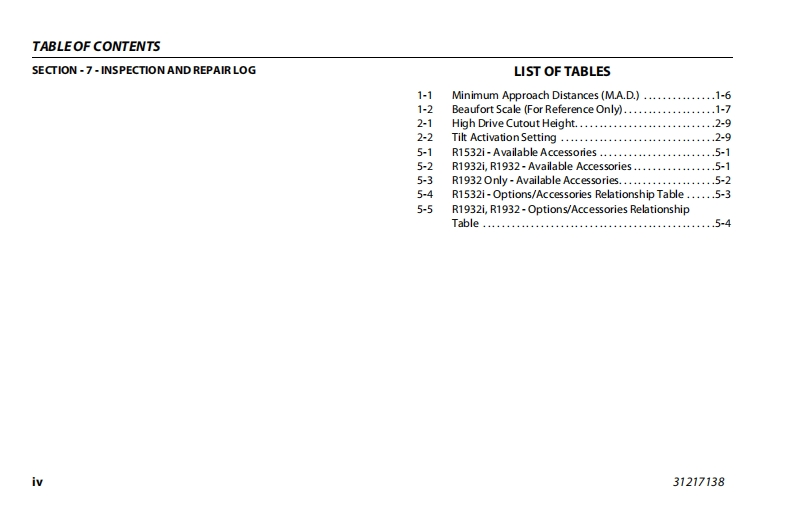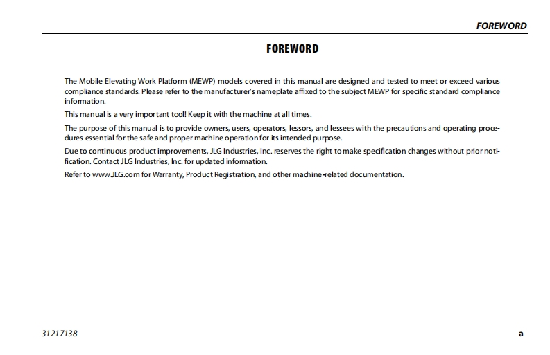 JLG-R1932-Operations-Manual操作与维护保养说明书手册找手册网昨天发布关注私信10.68MB118页028JLG-R1932-Operations-Manual操作与维护保养说明书手册此内容为付费资源,请付费后查看¥19¥21黄金会员免费钻石会员免费立即购买您当前未登录!建议登陆后购买,可保存购买订单付费资源 第1页 / 共118页 第2页 / 共118页 第3页 / 共118页 第4页 / 共118页 第5页 / 共118页 第6页 / 共118页 第7页 / 共118页 第8页 / 共118页 第9页 / 共118页 第10页 / 共118页 试读已结束,还剩108页,您可下载完整版后进行离线阅读 THE ENDJLG 文本预览 GAn Oshkosh Corporation CompanyOperation and Safety ManualOriginal Instructions-Keep this manual with the machine at all times.ModelsR1532iR1932iR1932PVC2004ANSI C∈①AS/NZS MOL70GB31217138March 15,2021-Rev C 查看更多 收起部分 喜欢就支持一下吧收藏