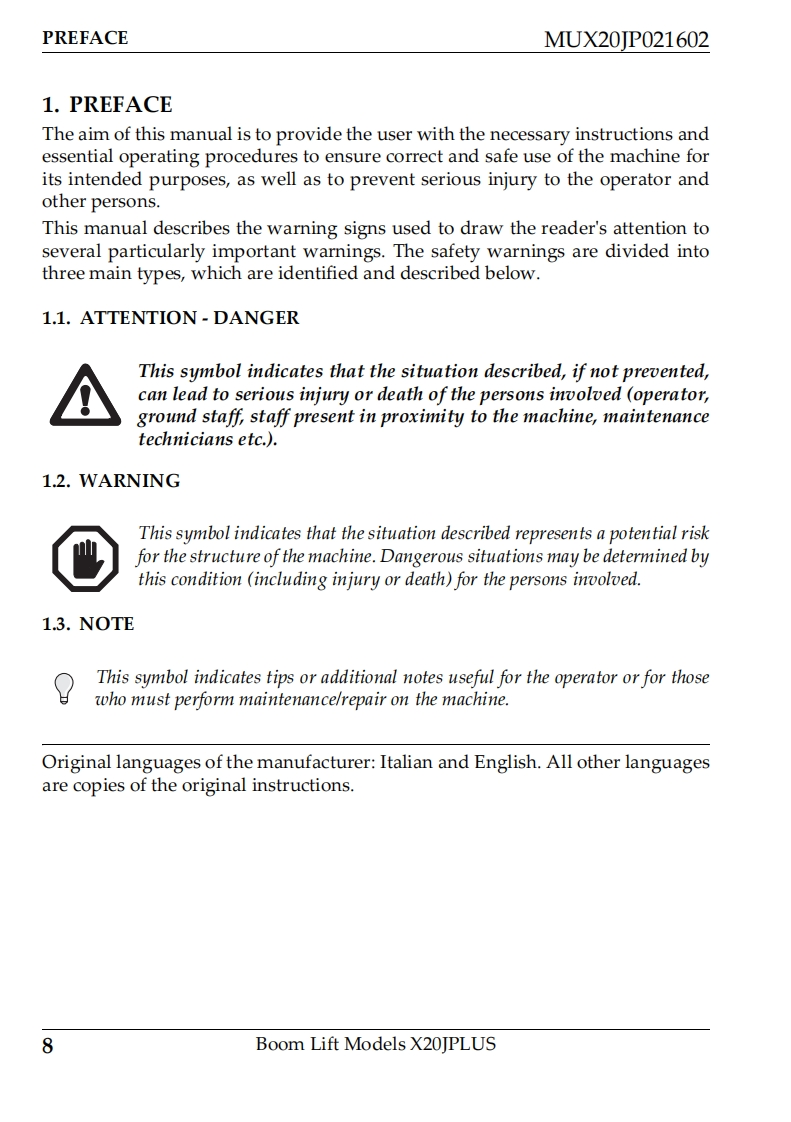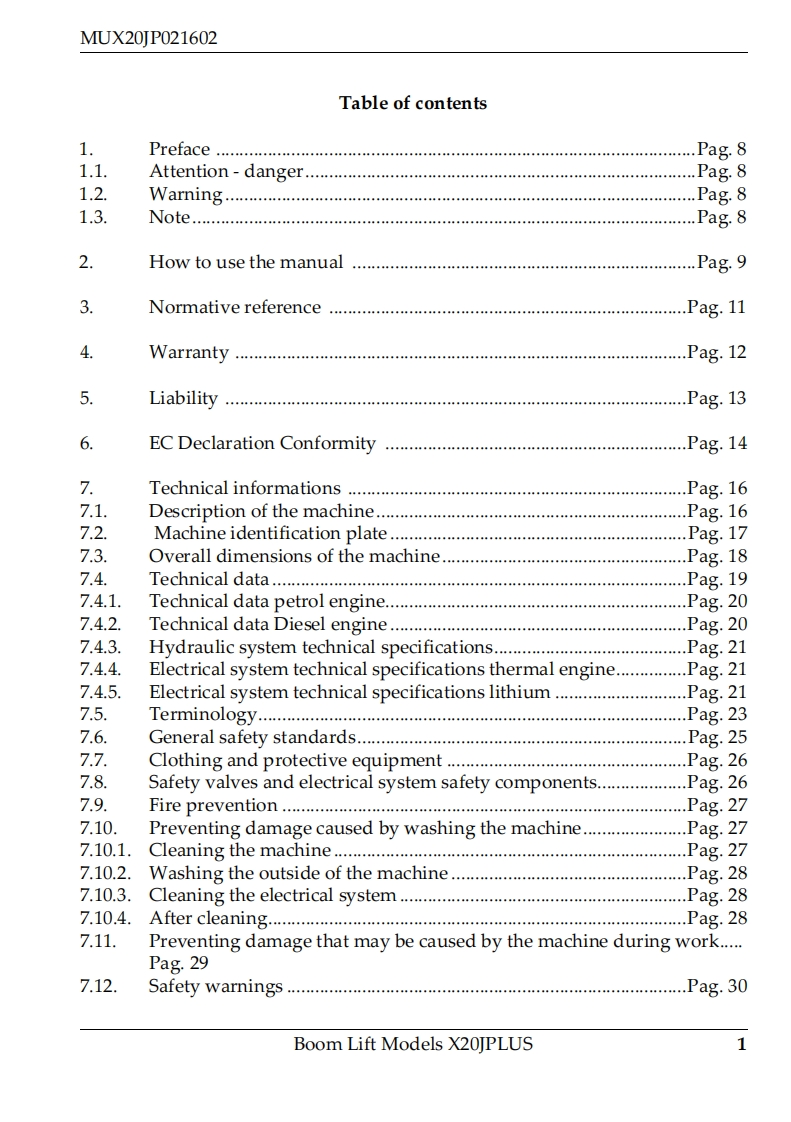 JLG-X20J-Plus-Operations-Manual操作与维护保养说明书手册找手册网昨天发布关注私信16.92MB206页049JLG-X20J-Plus-Operations-Manual操作与维护保养说明书手册此内容为付费资源,请付费后查看¥19¥21黄金会员免费钻石会员免费立即购买您当前未登录!建议登陆后购买,可保存购买订单付费资源 第1页 / 共206页 第2页 / 共206页 第3页 / 共206页 第4页 / 共206页 第5页 / 共206页 第6页 / 共206页 第7页 / 共206页 第8页 / 共206页 第9页 / 共206页 第10页 / 共206页 试读已结束,还剩196页,您可下载完整版后进行离线阅读 THE ENDJLG 文本预览 RAn Oshkosh Corporation CompanyOperator,Safety,Maintenanceand service ManualOriginal Instructions-Keep this manual with the machine at all timesBoom Lift ModelsX20JPLUS(€MUX20JP0216022016,revision02 查看更多 收起部分 喜欢就支持一下吧收藏