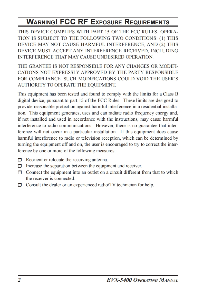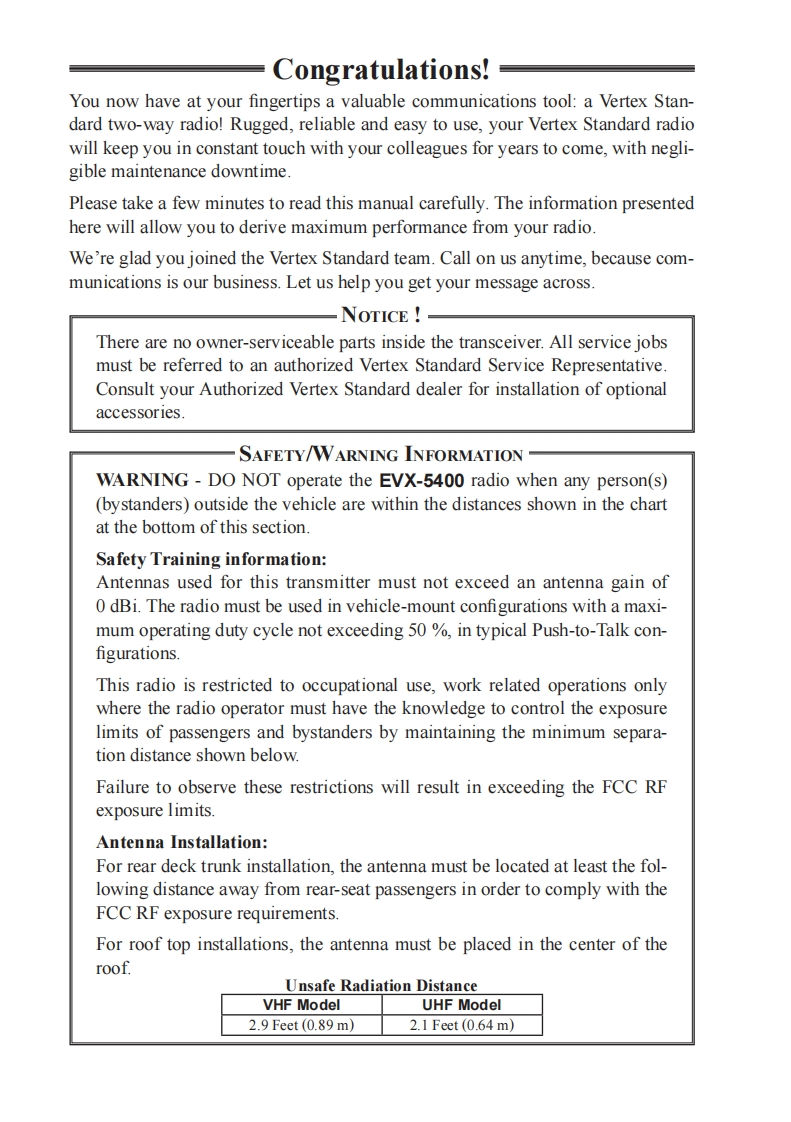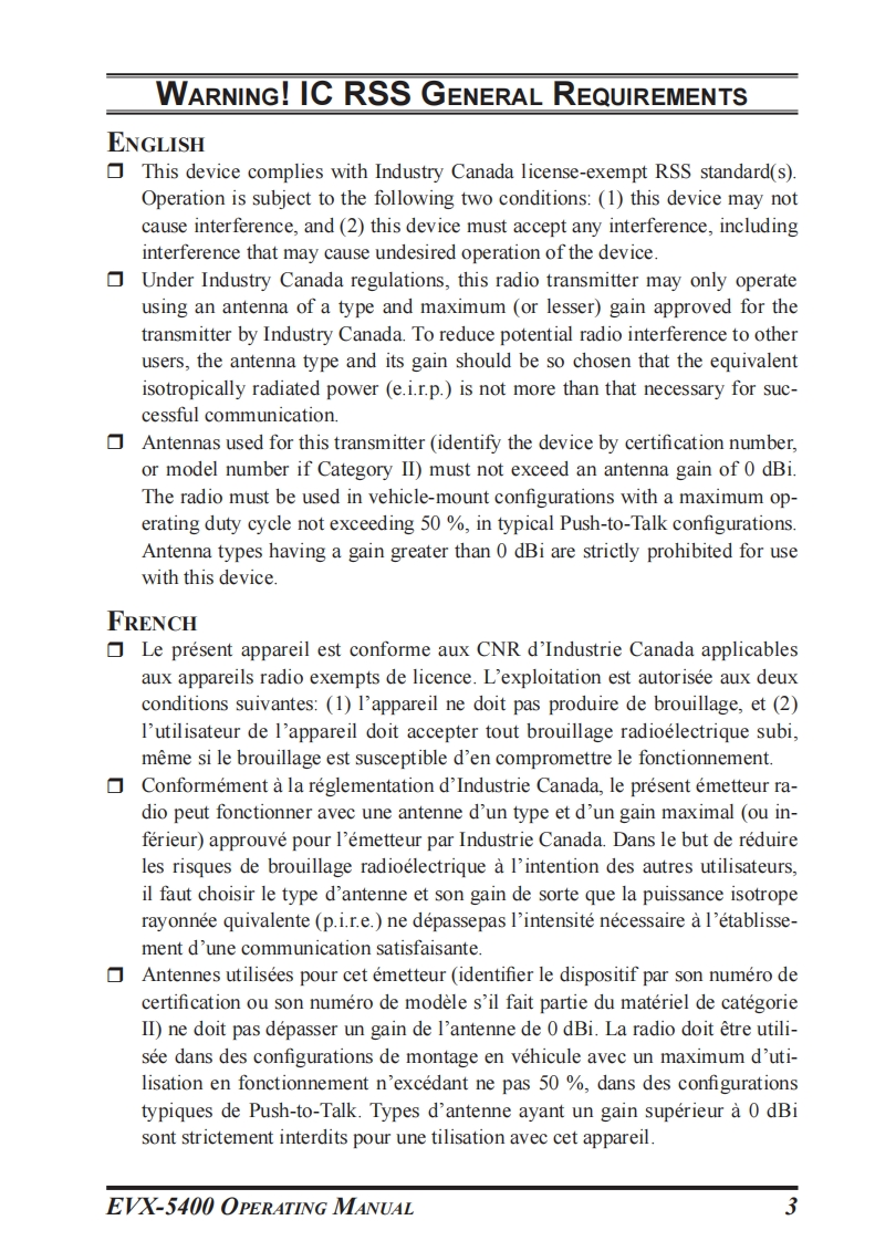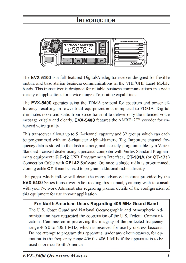 SVertex StandardEVX-5400OPERATING MANUALVertex Standard刚8 AL DWO可州日PBBEVX-5400PROGRAMMABLE FUNCTIONS/FEATURES6 Programmable Function Keys2-Tone Encode/Decodex15-Tone Encode/Decodex1●MDC-1200 Encode/Decodex1Hom AlertPA(Public Address)●ScanGroup Scan●Dual Watch●FM-Scan (Follow-Me Scan)TA ScanEncryptionx1Privacy (Basic/Enhanced)x2VOXTalk AroundEmergencyLone WorkerTX Save DisableDirect Channel Entryx3●Code Up/Downx1Code Setx1●Speed Dialx1DTMF Code Setx1.3ID Check1TX Messagex1.ARTSTMX1/ARTSIITM (Auto Range Transpond System)1:Analog mode onlyx2:Digital mode only3:Requires Optional MH-75A8J