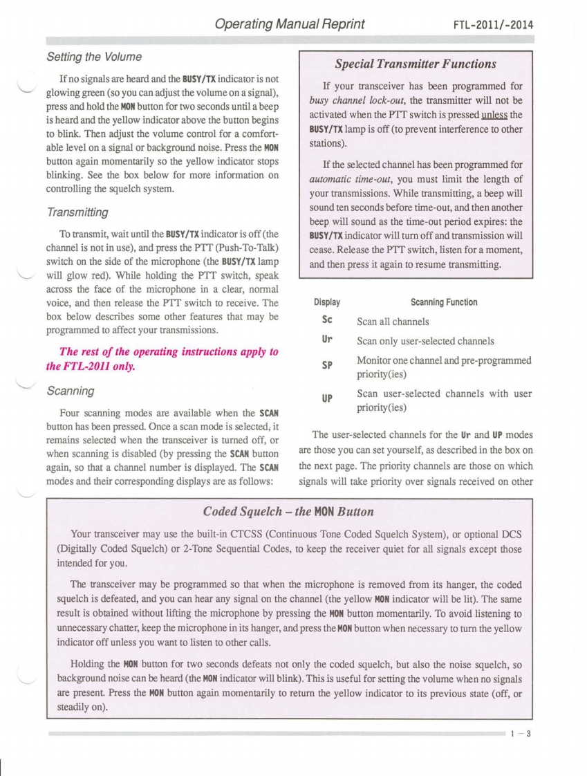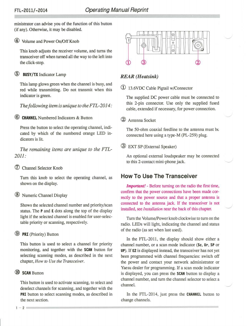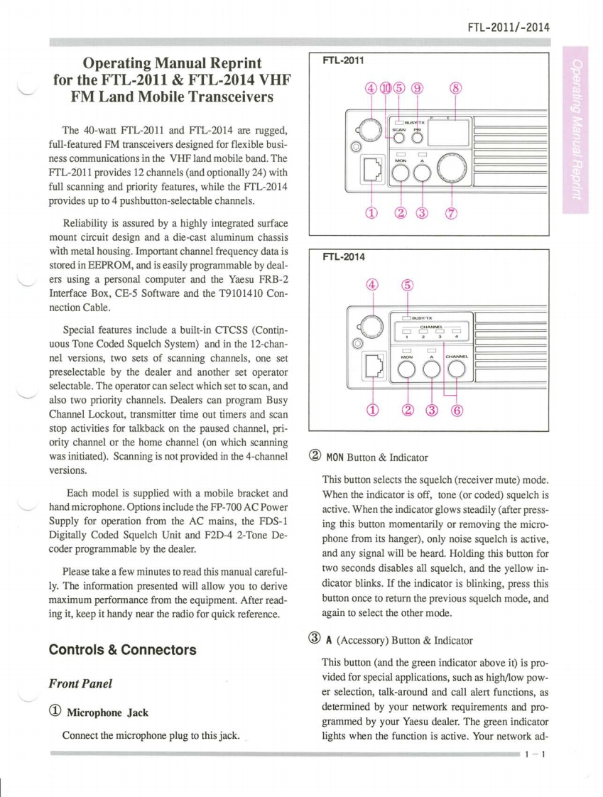 YAESUYAESUSERVICE MANUALVHF FM Land Mobile TransceiversFTL-2814The 40-watt FTL-2011 and FTL-2014 are rugged,full-featured FM transceivers designed for flexible busi-ness communications in the VHF land mobile band.TheFTL-2011 provides 12 channels (and optionally 24)withfull scanning and priority features,while the FTL-2014provides up to 4 pushbutton-selectable channels.FTL-2014YAESU MUSEN CO.,LTD.C.PO.BOX 1500,TOKYO.JAPANYAESU U.S.A.17210 Edwards Rd.Cerritos,California,90701 U.S.A.YAESU EUROPE B.V.Snipweg 3.1118AA Schiphol The NETHERLANDSFTL-2011