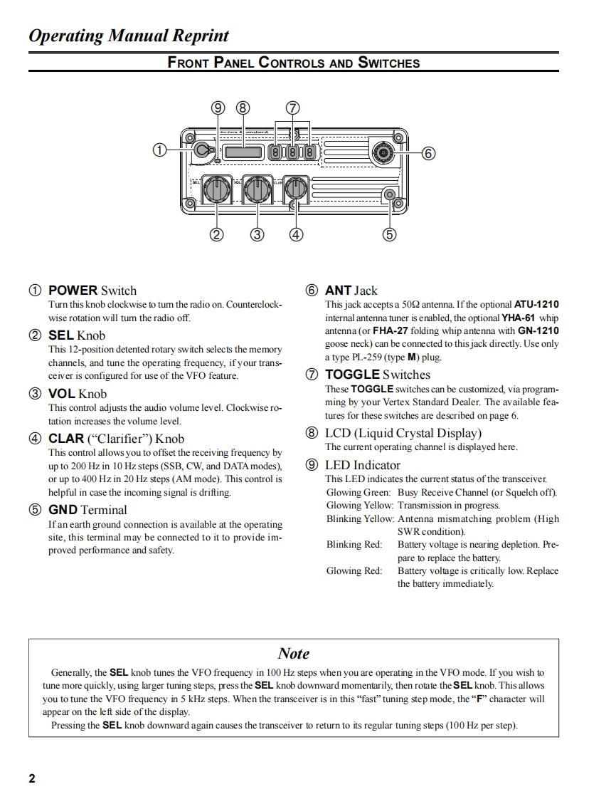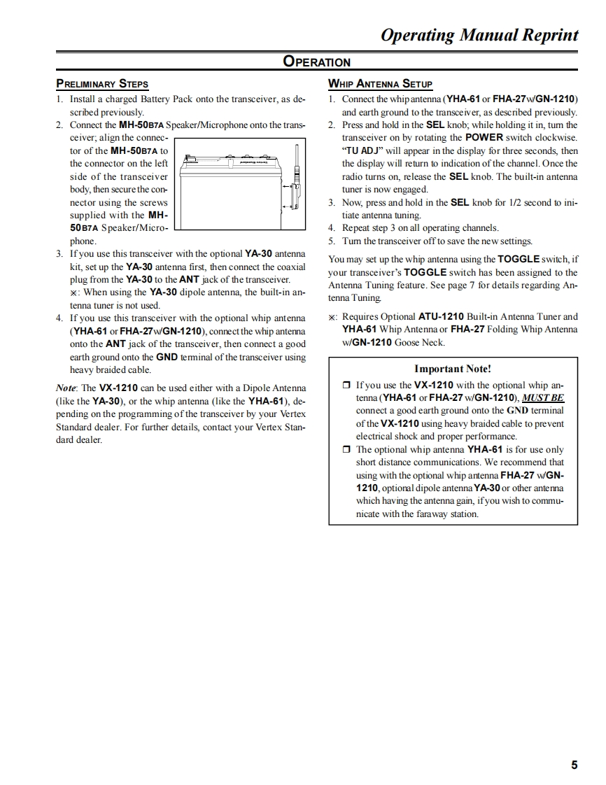 Vertex StandardVERTEX STANDARD CO.,LTD.4-8-8 Nakameguro,Meguro-Ku,Tokyo 153-8644,JapanVERTEX STANDARDVX-1210Intemational Division8350 N.W.52nd Termace,Sute 201,Miami,FL 33166,U.SA.YAESU EUROPE B.V.P.O.Box 75525,1118 ZN Schiphol,The NetherlandsService ManualYAESU UK LTD.Unt 12,Sun Valley Business Park,Wimall CloseWinchester,Hamoshire.SO23 0LB.U.K.VERTEX STANDARD HK LTD.2001 VERTEX STANDARD CO.,LTD.Printed in JapaneeinRadIntroductionThis manual provides technical information necessary for servicing the VX-1210 Transceiver.Servicing this equipment requires expertise in handling surface-mount chip components.Attempts by non-qualified persons toservice this equipment may result in permanent damage not covered by the warranty,and may be illegal in some countries.Two PCB layout diagrams are provided for each double-sided circuit board in the transceiver.Each side of thr board is referredto by the type of the majority of components installed on that side("leaded"or"chip-only").In most cases one side has only chipcomponents,and the other has either a mixture of both chip and leaded components(trimmers,coils,electrolytic capacitors,ICs,etc.),or leaded components only.While we believe the technical information in this manual to be correct,VERTEX STANDARD assumes no liability for damagethat may occur as a result of typographical or other errors that may be present.Your cooperation in pointing out any inconsistenciesin the technical information would be appreciated.ContentsOperating Manual Reprint..................2Board Unit(Schematics,Layouts Parts)Specifications10MAIN Unit..…29Installation Manual Reprint....................11CNTL Unit…45SEL-1200(Option).11PA Unit.......57Display Unit.....65ATU-1210(Option)….12ConnectionDSV-1200(0pti0n).14MIC-CONN Unit...68Exploded View Miscellaneous Parts ....15BATT-CONN Unit .....69Block Diagram..7TUNER Unit (ATU-1210:Option).....1SELCALL Unit (SEL-1200:Option).4Interconnection Diagram.18Circuit Description.19
